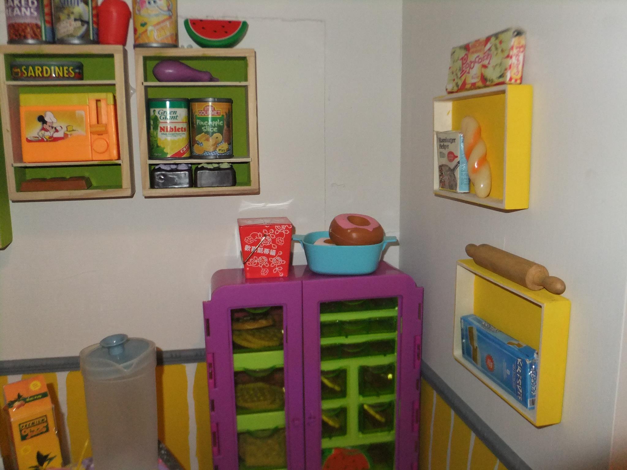 So let me just explain this. The purple and green ‘fridge’ is a broken Polly Pocket suitcase. The shelves on the walls are all the wooden stamp trays that the Melissa and Doug stampers come in. I just painted them up with some bright coloured paint. I am very proud that I found a use for those. I just love to reuse things and they match the yellow on the walls that i painted in stripes beneath the tiny chair rail.