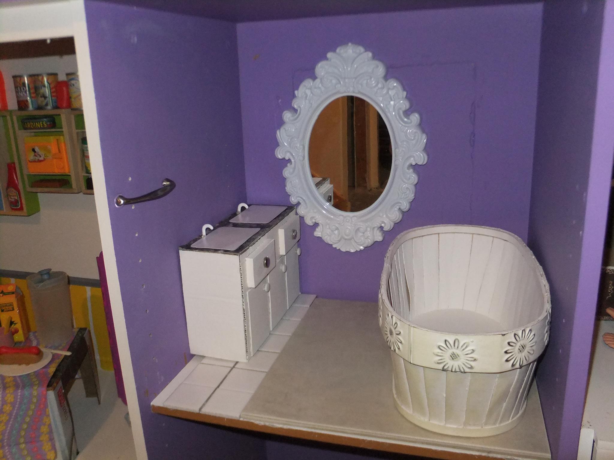 Here is a look at the bathroom. Since this we have accumulated a pink Our Generation bath tub but I wanted to show what you can do on a budget.