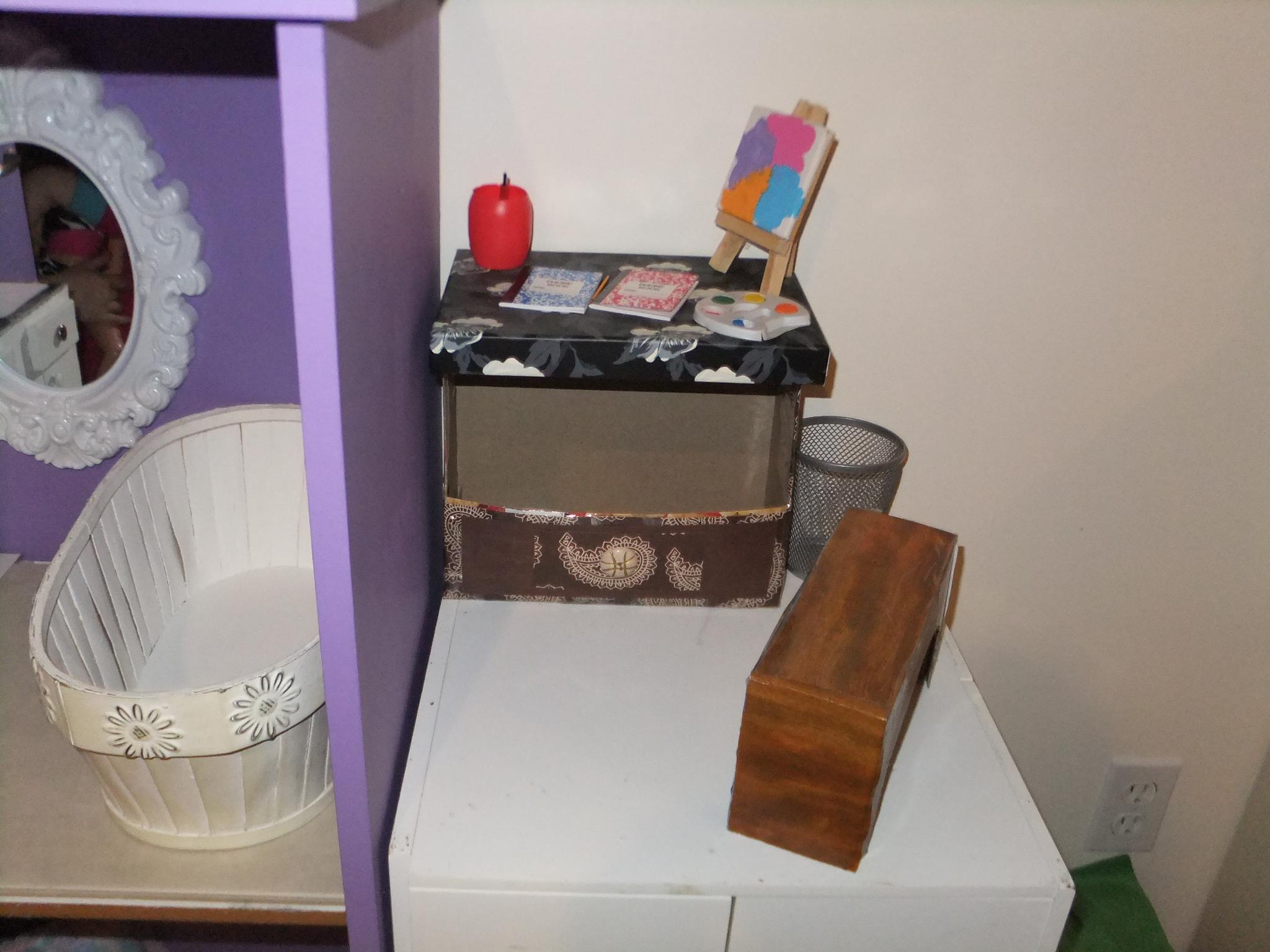 I also made this little desk from a cracker box with the lid to the photo box that I used for the bathroom sink stuck on top.