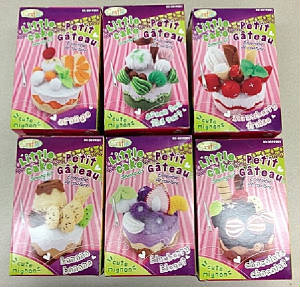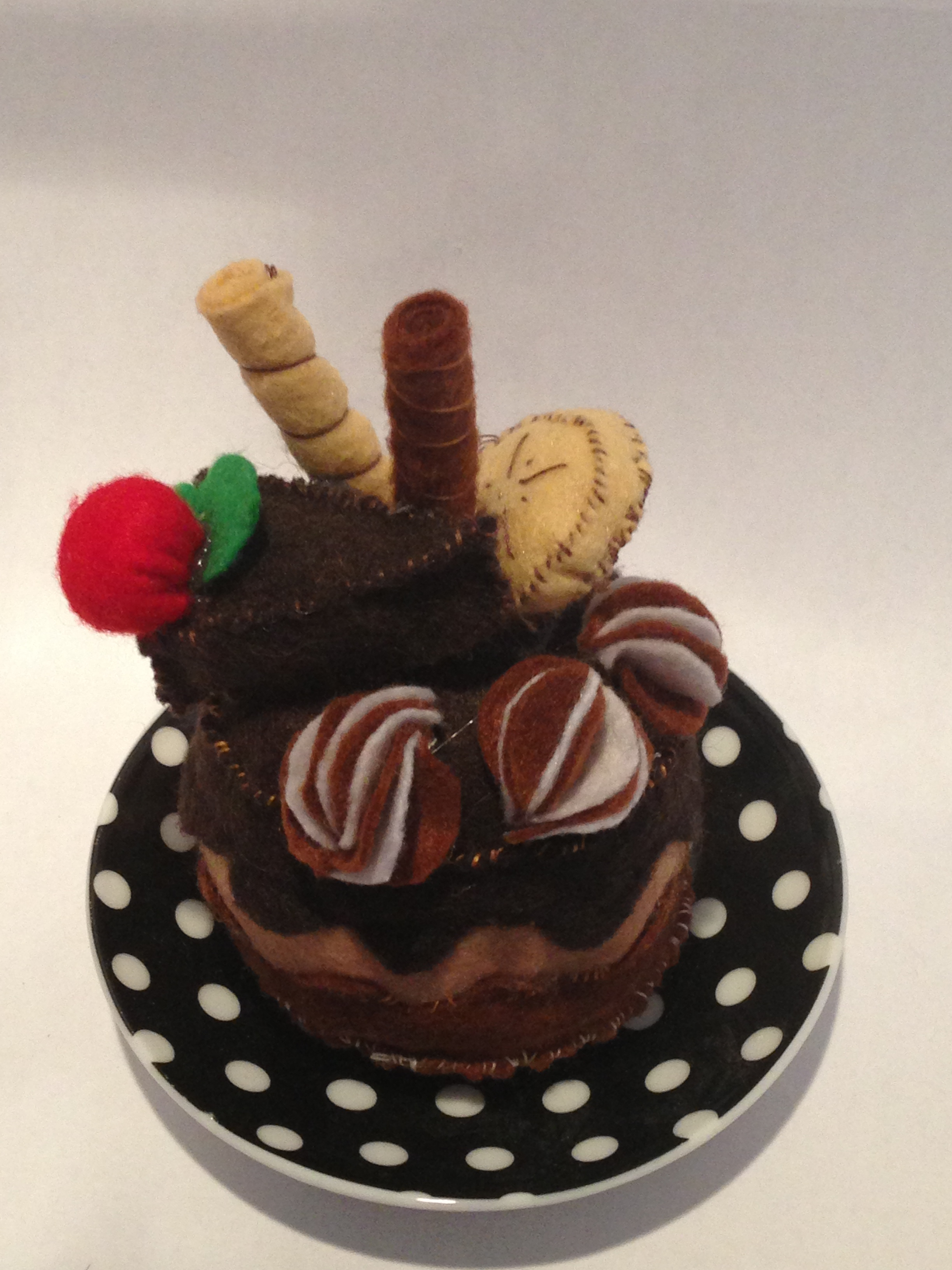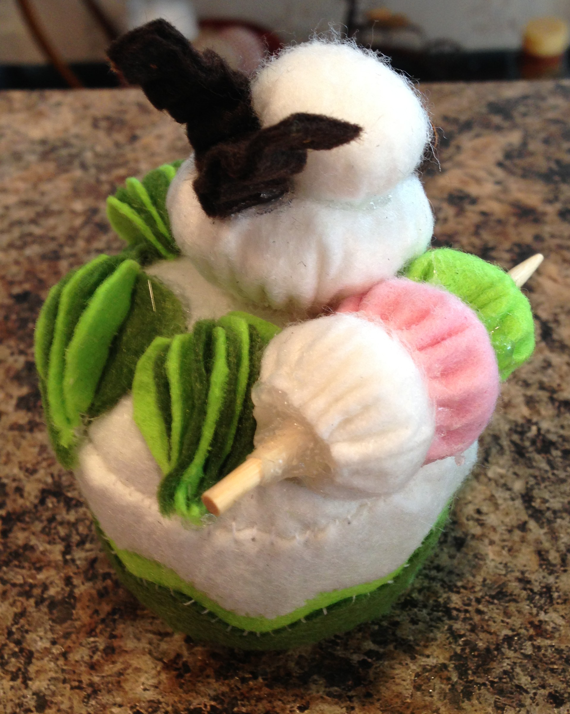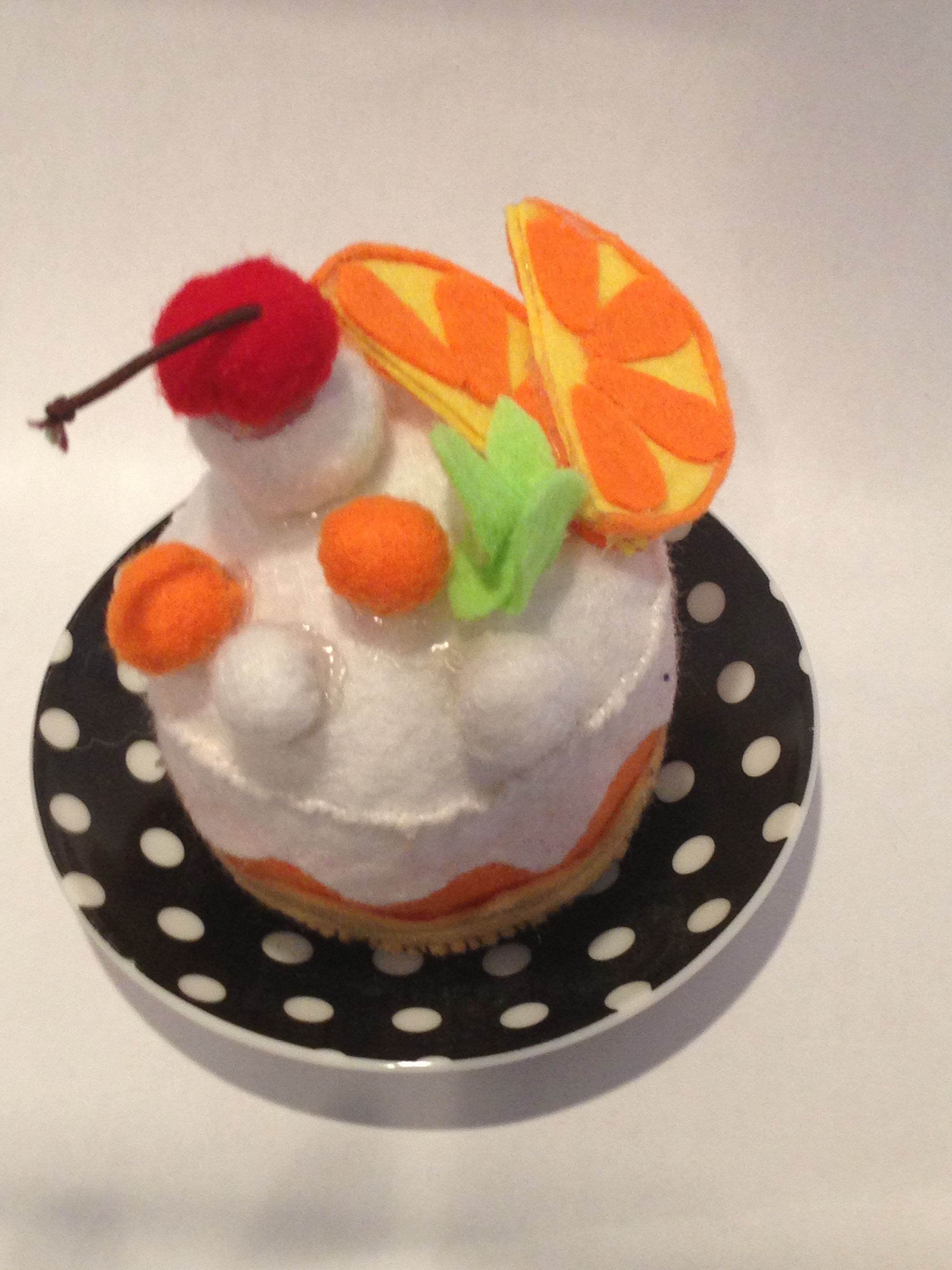 Last I sewed some adorable little cakes out of felt. We got these at the Dollarama too. I have a few of these kits, but so far I have only made three of them. Secret: After about the first half hour of sewing these babies, I just gave up and hot glued the whole hot mess together. It was about eight hundred times faster and easier, and it still looks exactly the same. Don’t tell anyone.