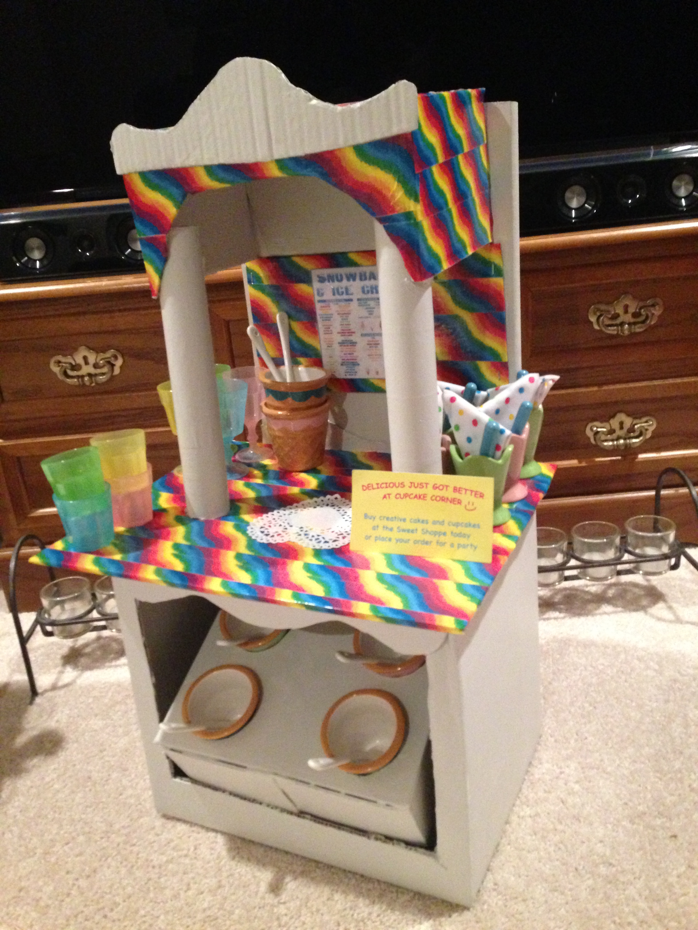 Next, I wanted to build the ice cream stand. This was tricky. I didn’t have the foggiest idea of where to start so I did what I usually do. I took all of those cardboard boxes, and faked my way through it. That’s how I craft most of the time. I just wing it at whatever o’clock in the morning. Some call it crazy. I call it genius, and I really do understand why most of them, geniuses I mean, have crazy hair. Don’t judge me. 🙂