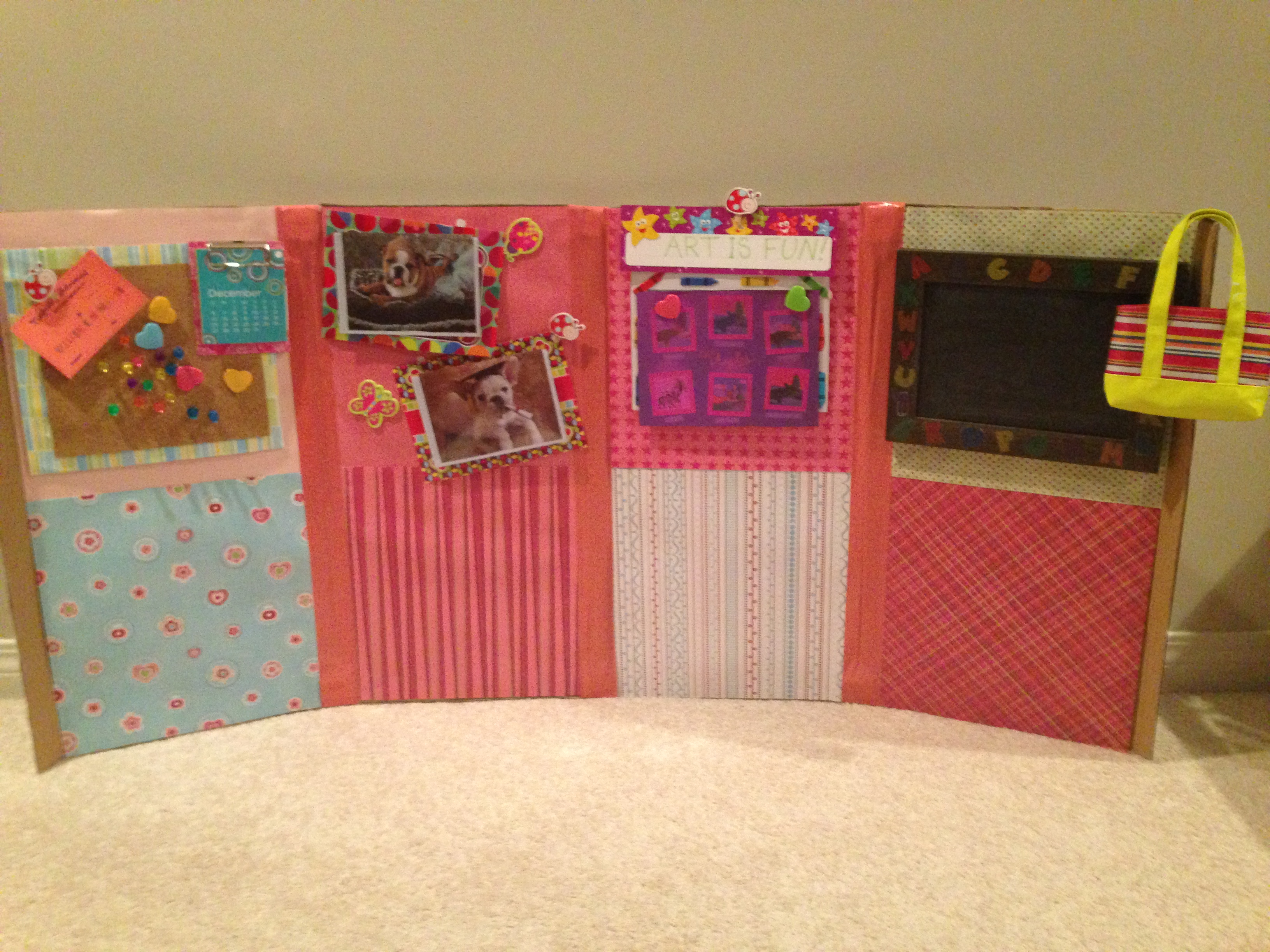 The first thing you will need if you would like to make a doll school is a very large piece of sturdy cardboard. This will act as your backdrop. It is best if it already has folds in it. One of those trifold science project boards would probably work well.