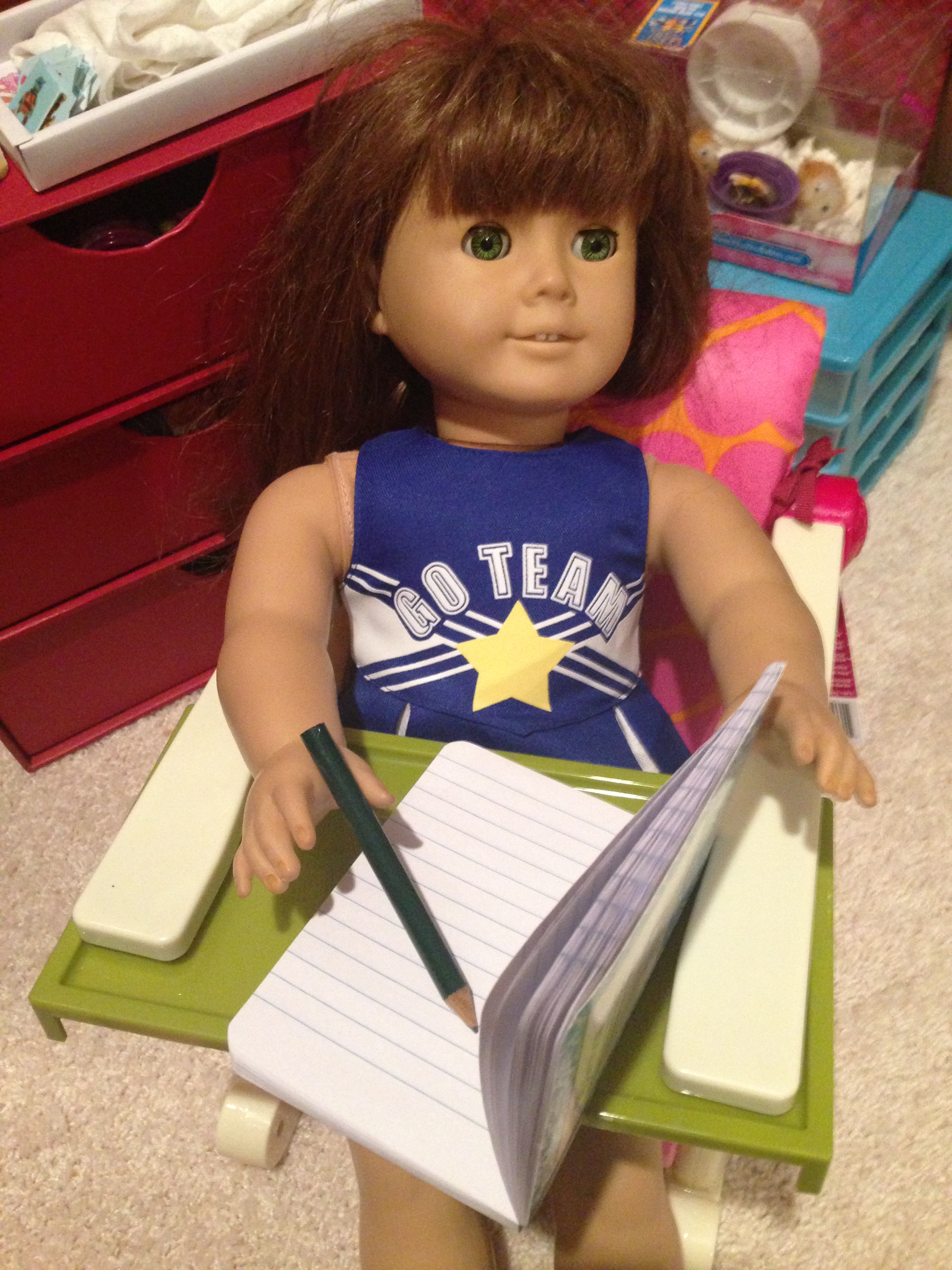 I don’t have an actual doll desk, but this little clip on dining chair works for now. Maybe that will have to be a craft for another day. 🙂