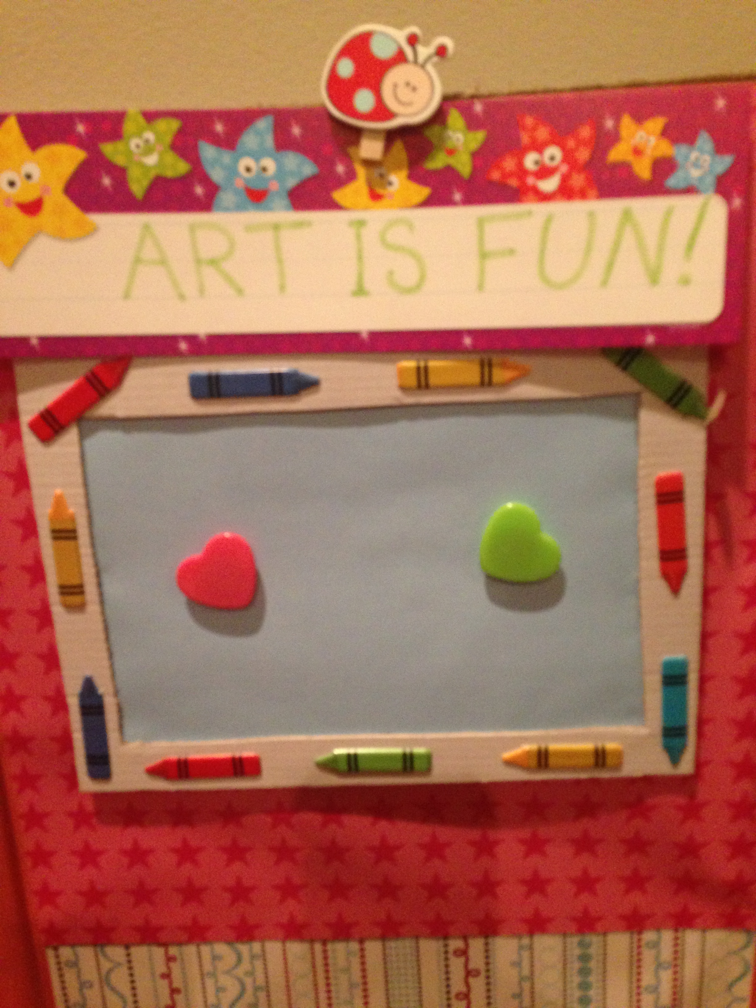 That one says, “Art is Fun” but it can be changed out simply by removing it from the clothespin. Some other bulletin board label ideas are: Picture Day Today! Music Class Rocks! Science Lab Due!