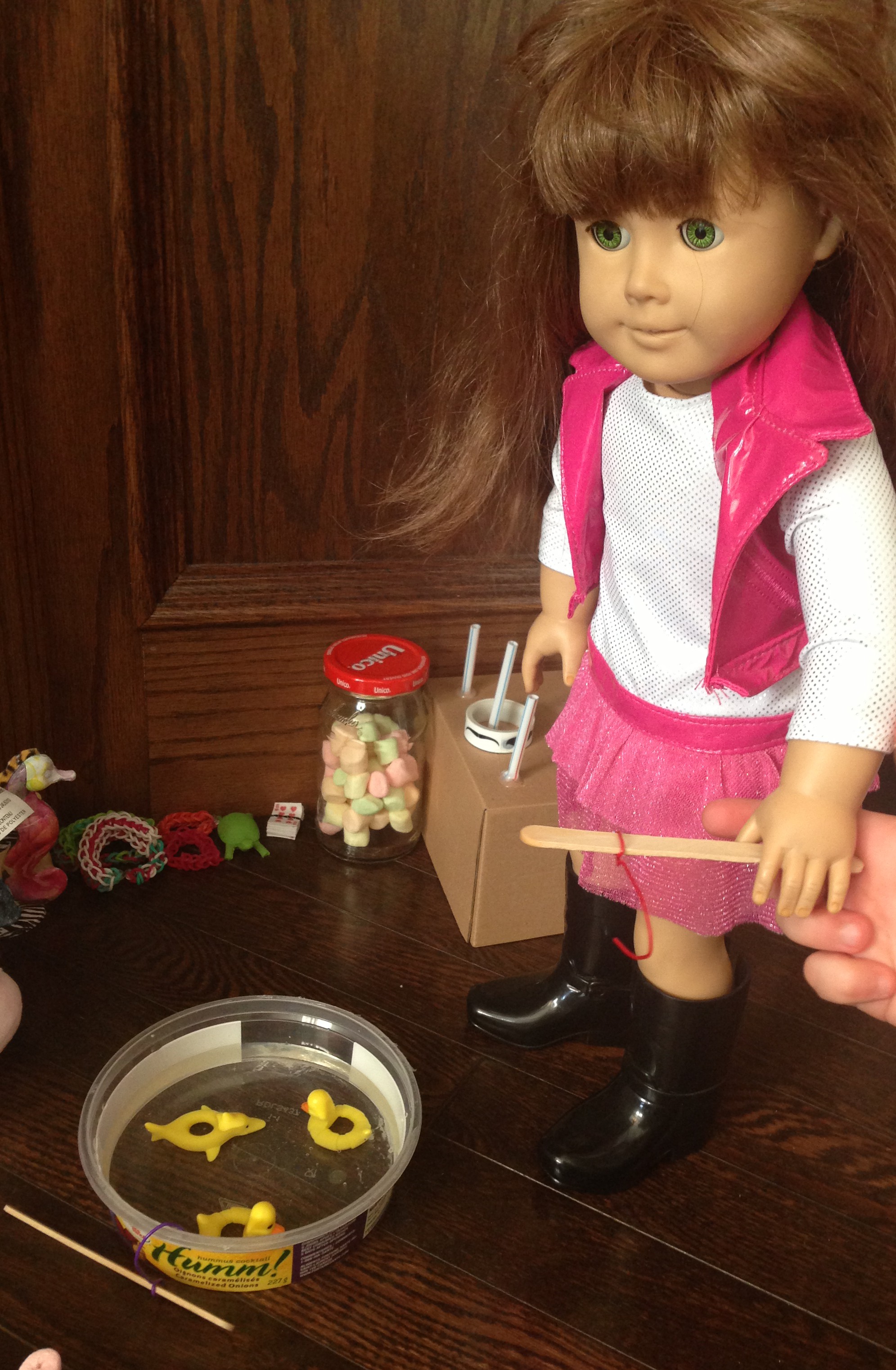 Our duck fishing pond turned out to be as simple as the ones at the actual fair. My daughter says that it doesn’t matter because we can just pretend that it’s a baby game. Even so, our doll Samantha had to try it out anyway. She doesn’t mind playing games for babies.