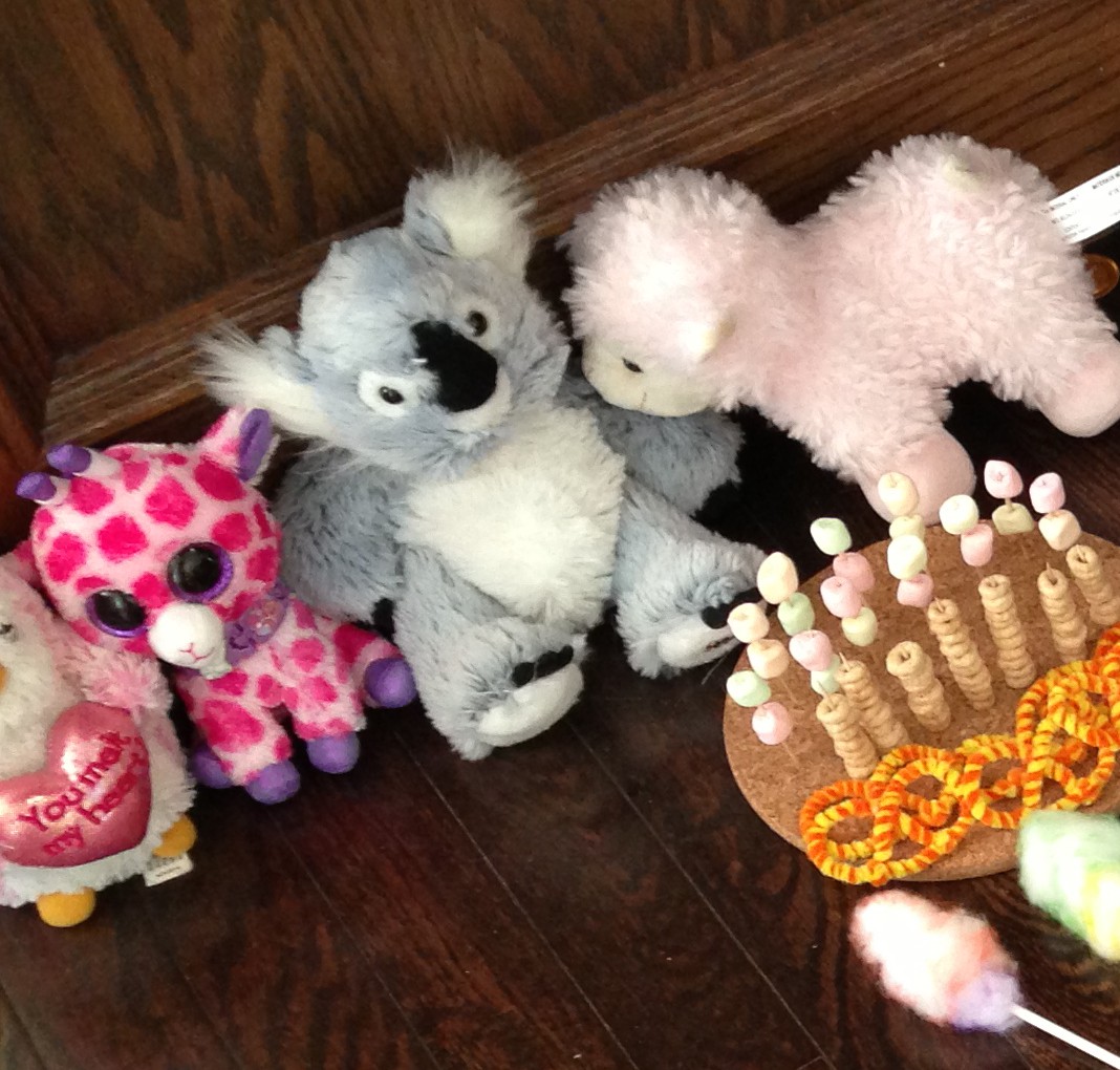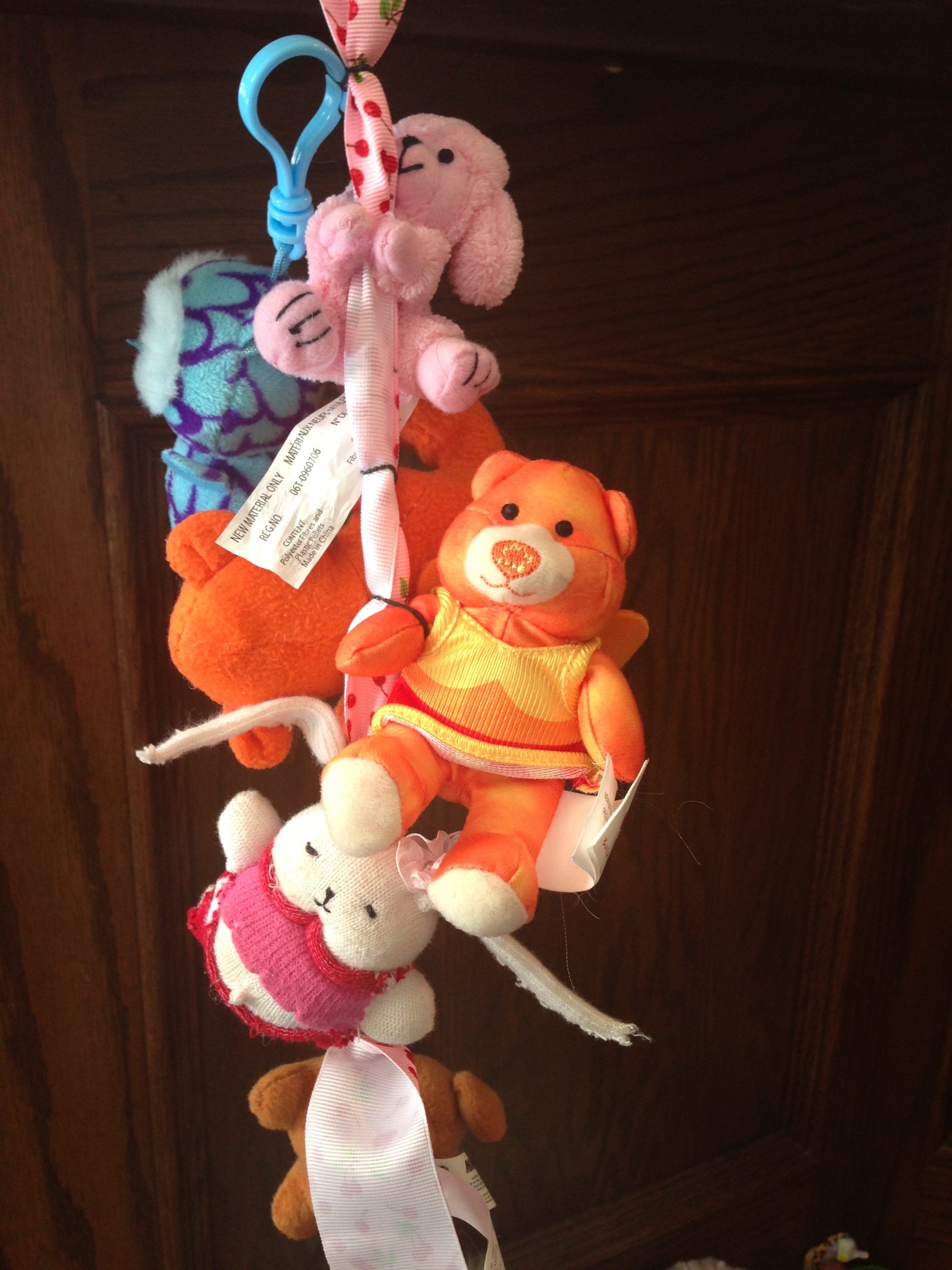 We had small, medium and large prizes. The rope ladder of stuffed toys was made with a piece of ribbon. I just attached the stuffies using small elastic bands so that we could easily remove them. The smallest prizes were loom bracelets, and we had some bigger stuffies as large prizes.