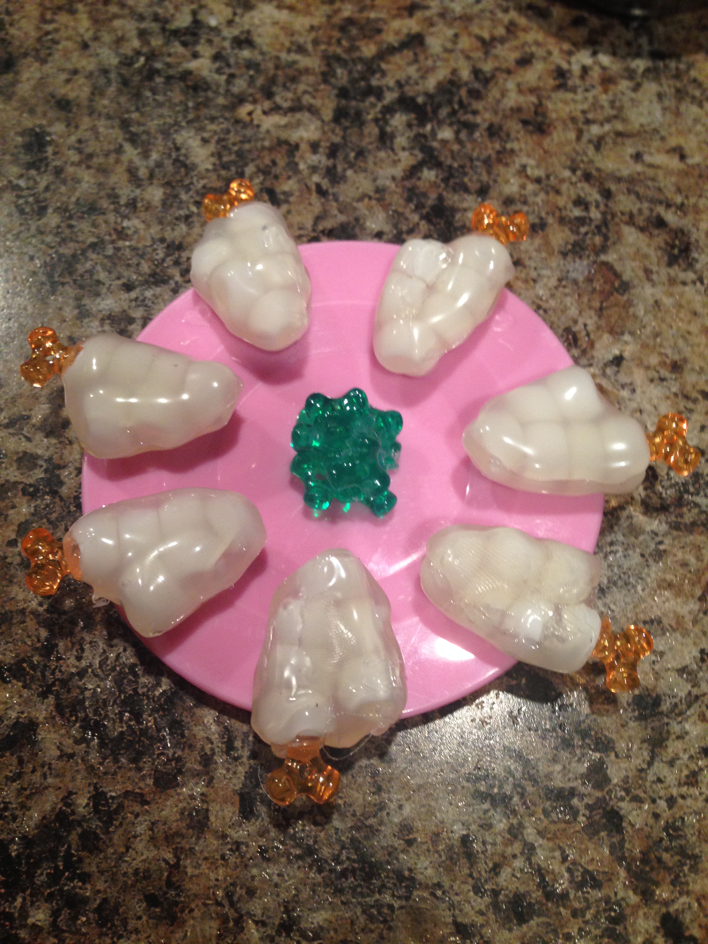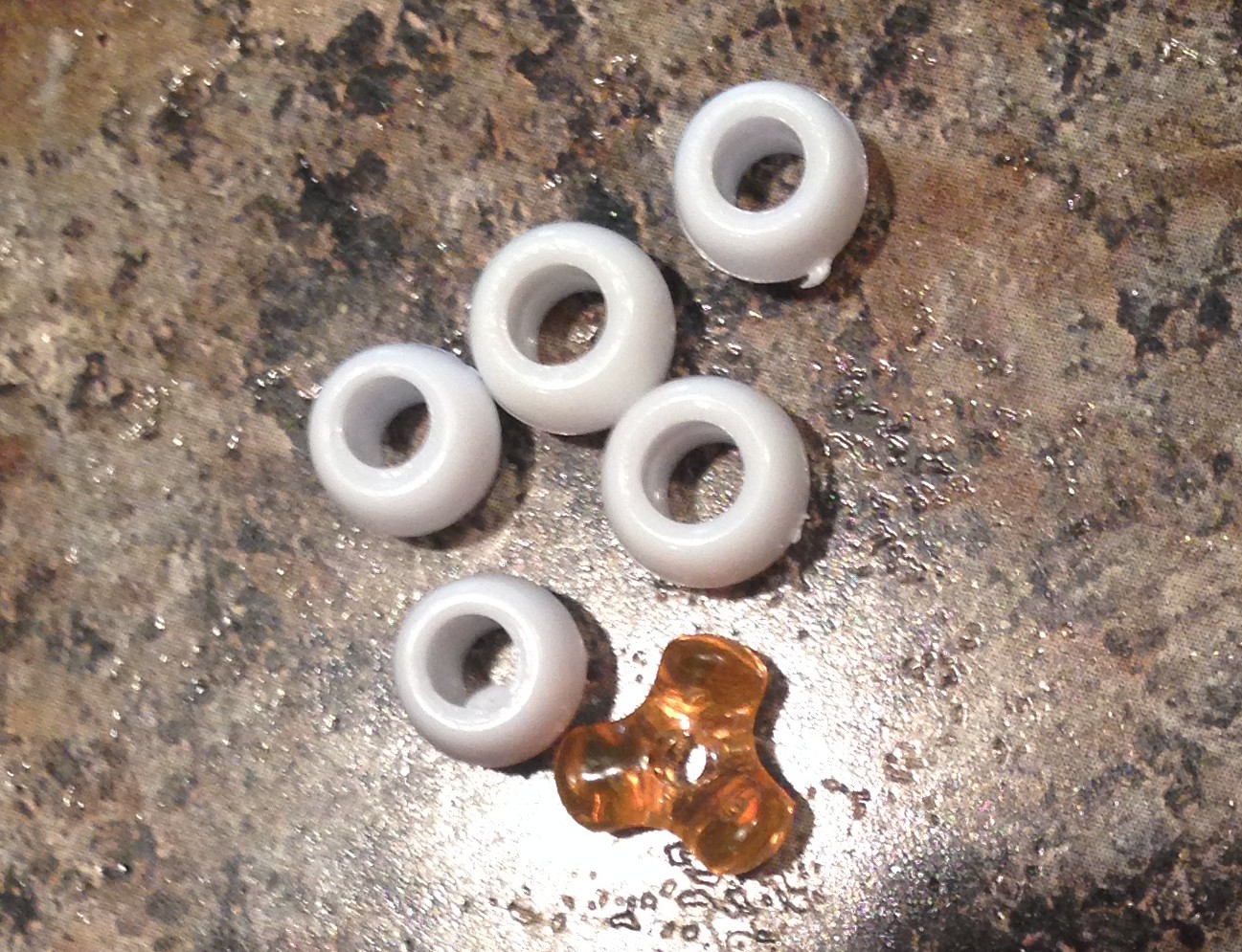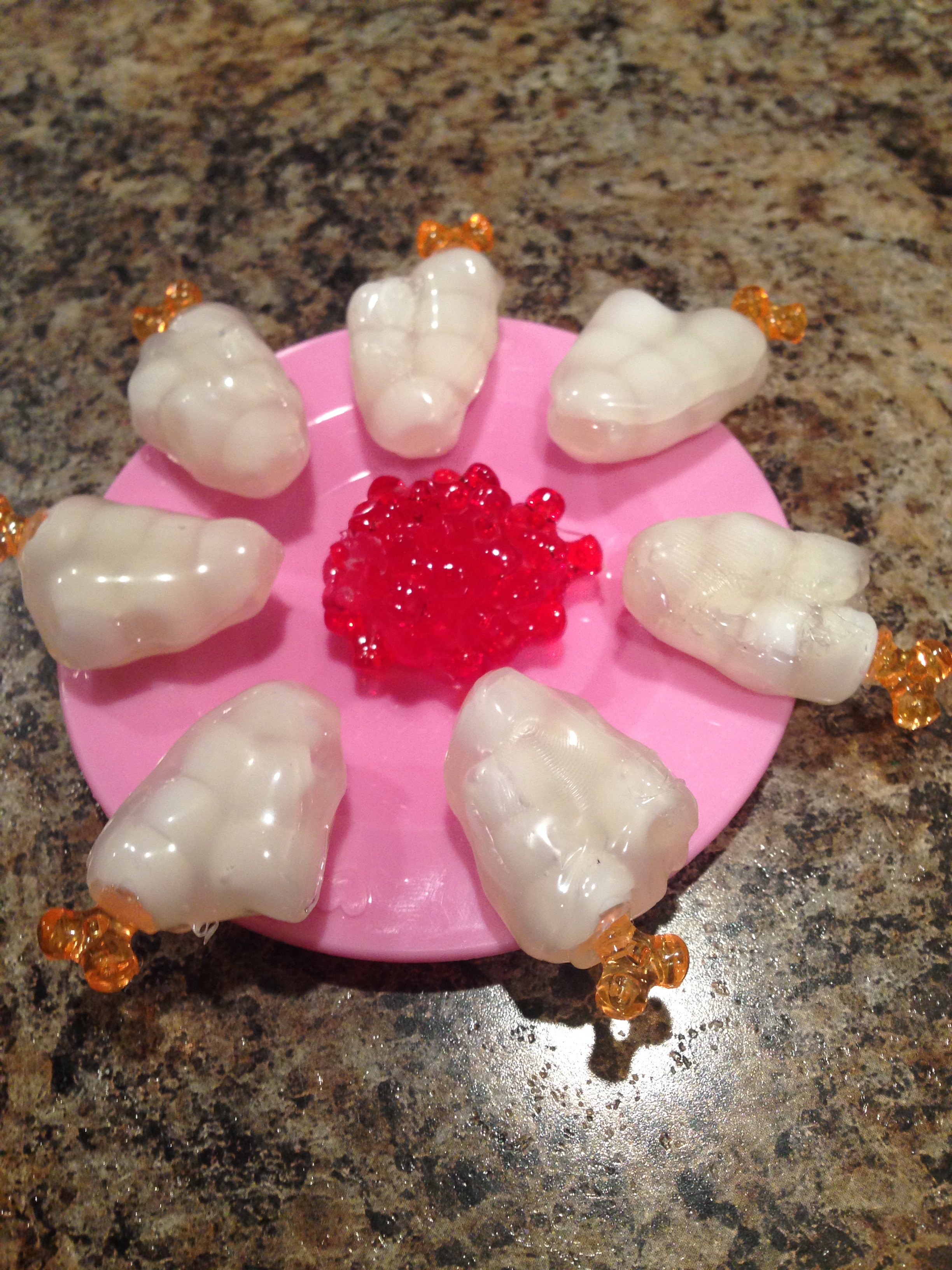 To make the fish egg garnish, I used a pile of small coloured transparent T beads, the ones that look like a T shape. I coated them in hot glue and let them dry on a piece of wax paper. Peel them off and they look like a blob of shiny fish eggs.