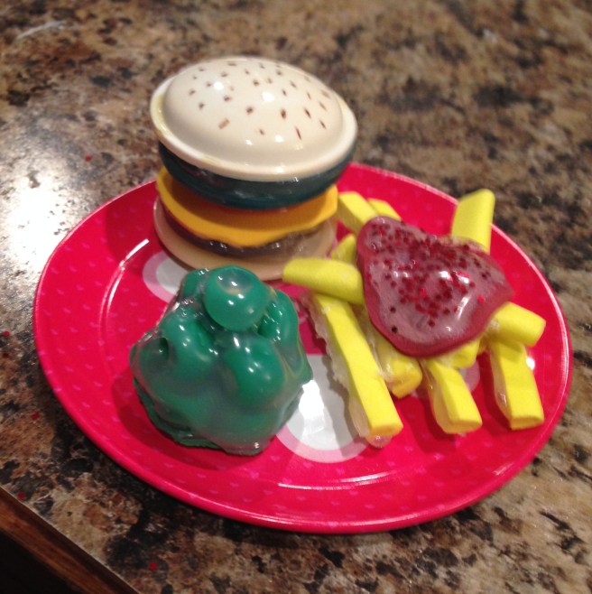 Cut them to size and arrange them on your plate. For ‘ketchup’, I cut out a small piece of red craft foam and glued it on top of my pile of fries. I covered the red foam with hot glue to make it shiny. Then I sprinkled some red glitter on top.