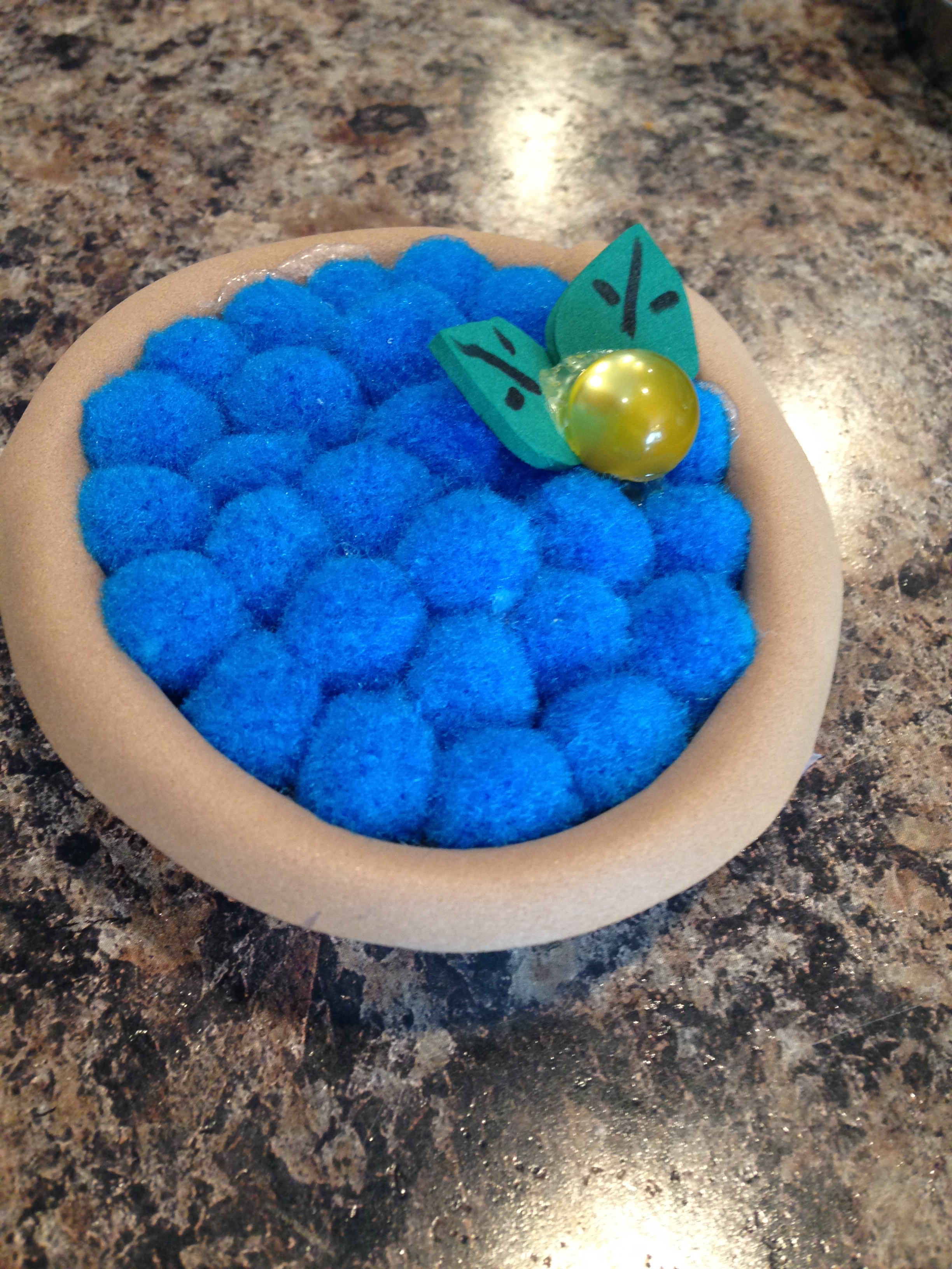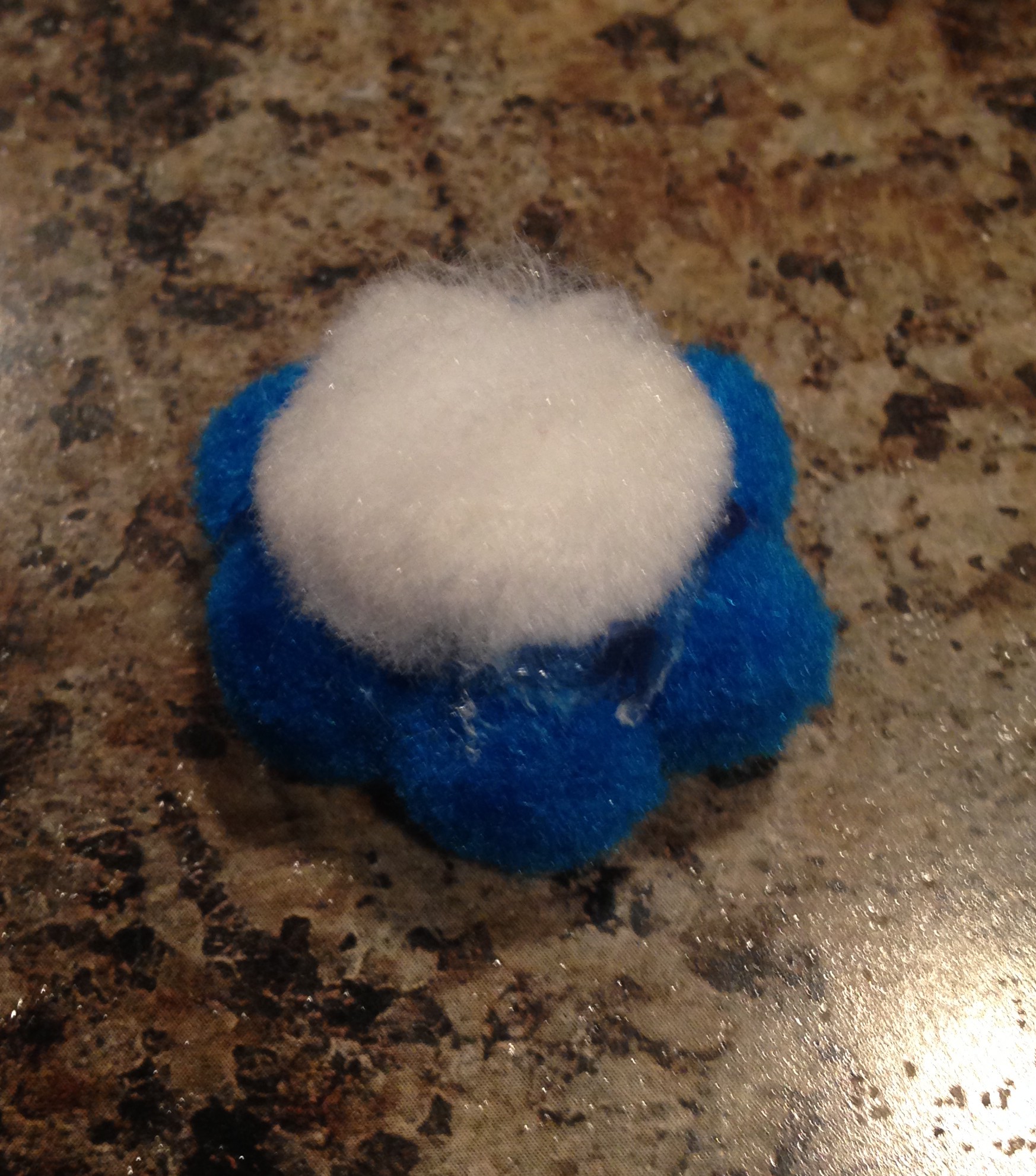 Fill your pie crust with poly fill or cotton balls. At this point you can start thinking about what kind of pie you would like to make. We made a blueberry pie because we had a lot of blue pom poms on hand. If you don’t have pom poms, you can use pony beads or even cut berry shaped pieces of craft foam to glue on top.