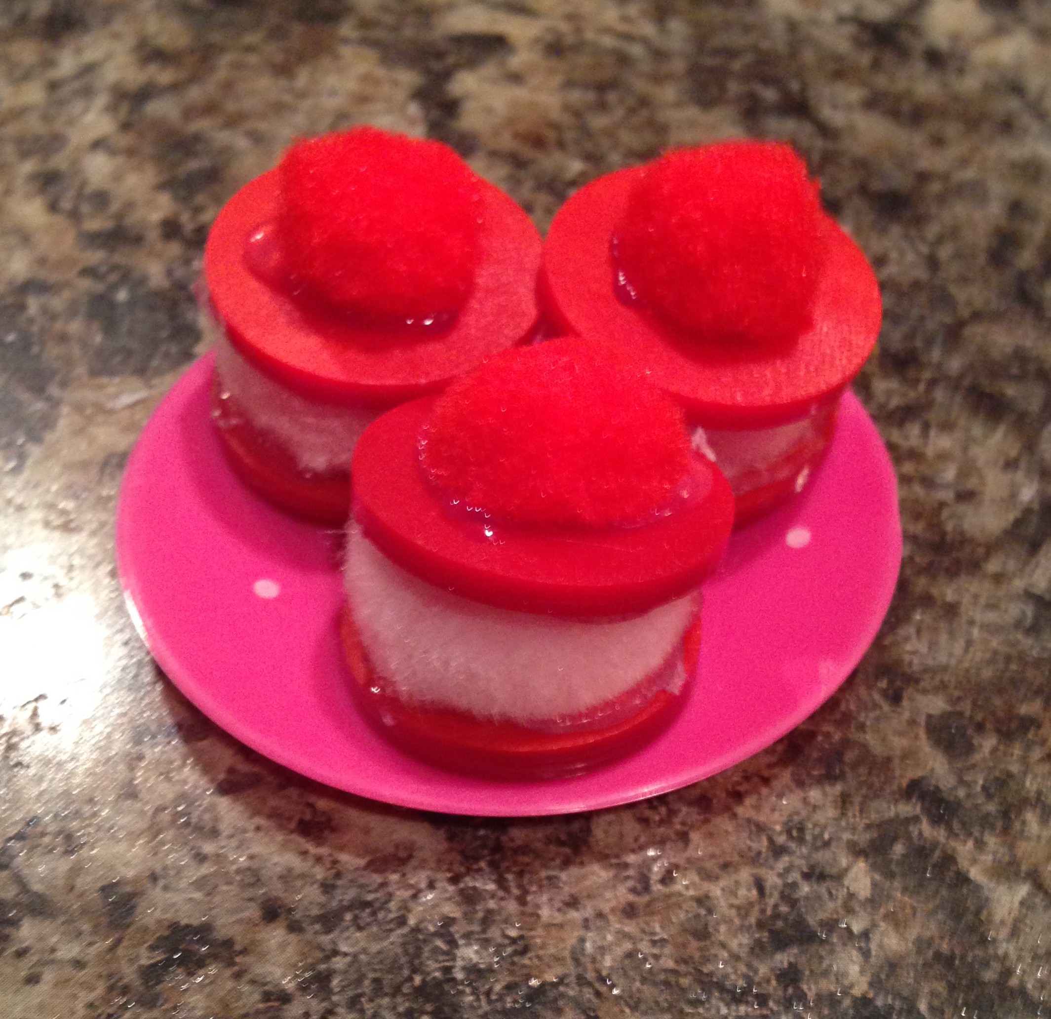 Once I had messed around a bit with gluing pom poms together, I decided to mix it up a bit. I took two red buttons and mashed a pink pom pom in the centre like a sandwich. I thought they were cute as macarons.