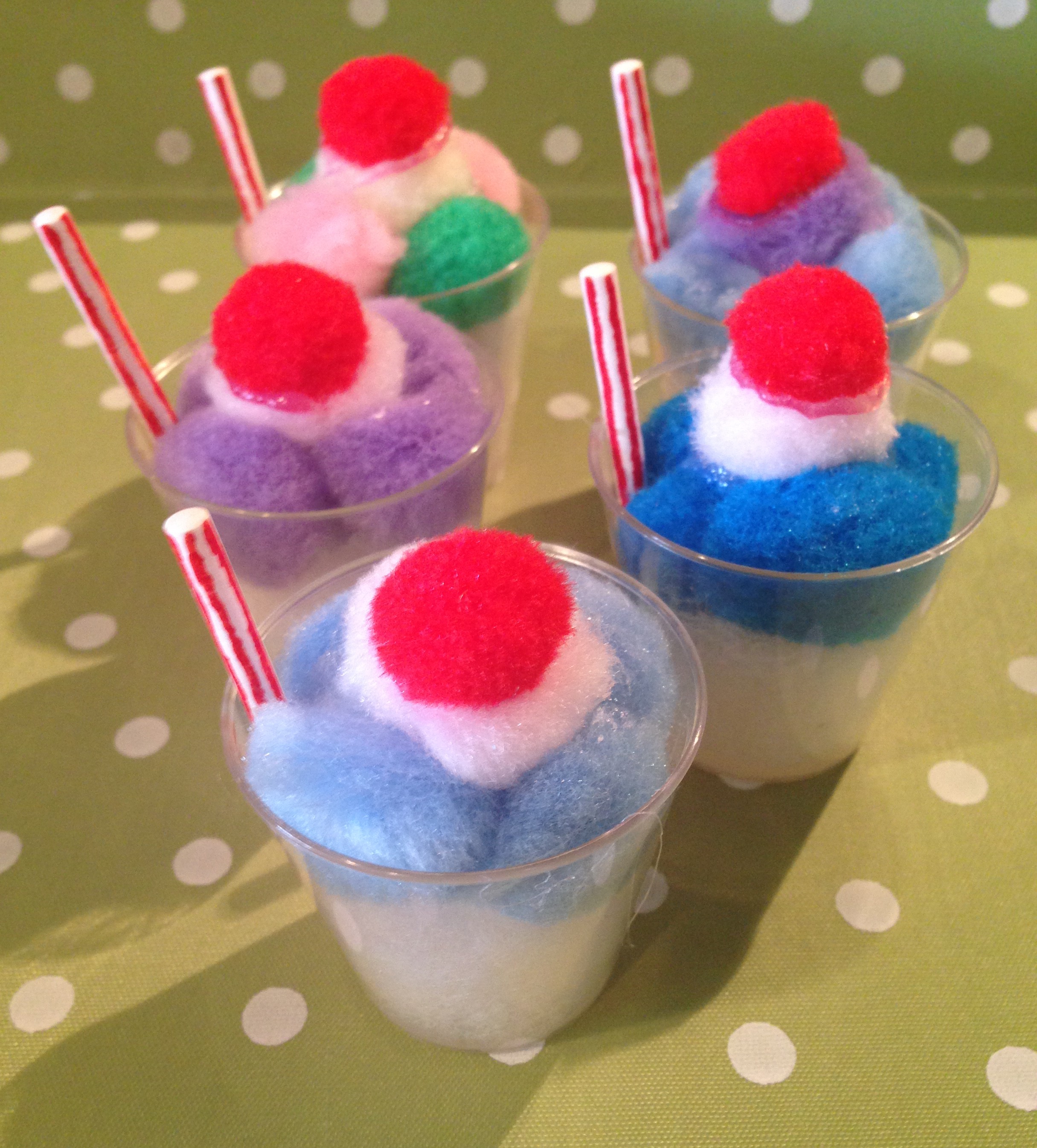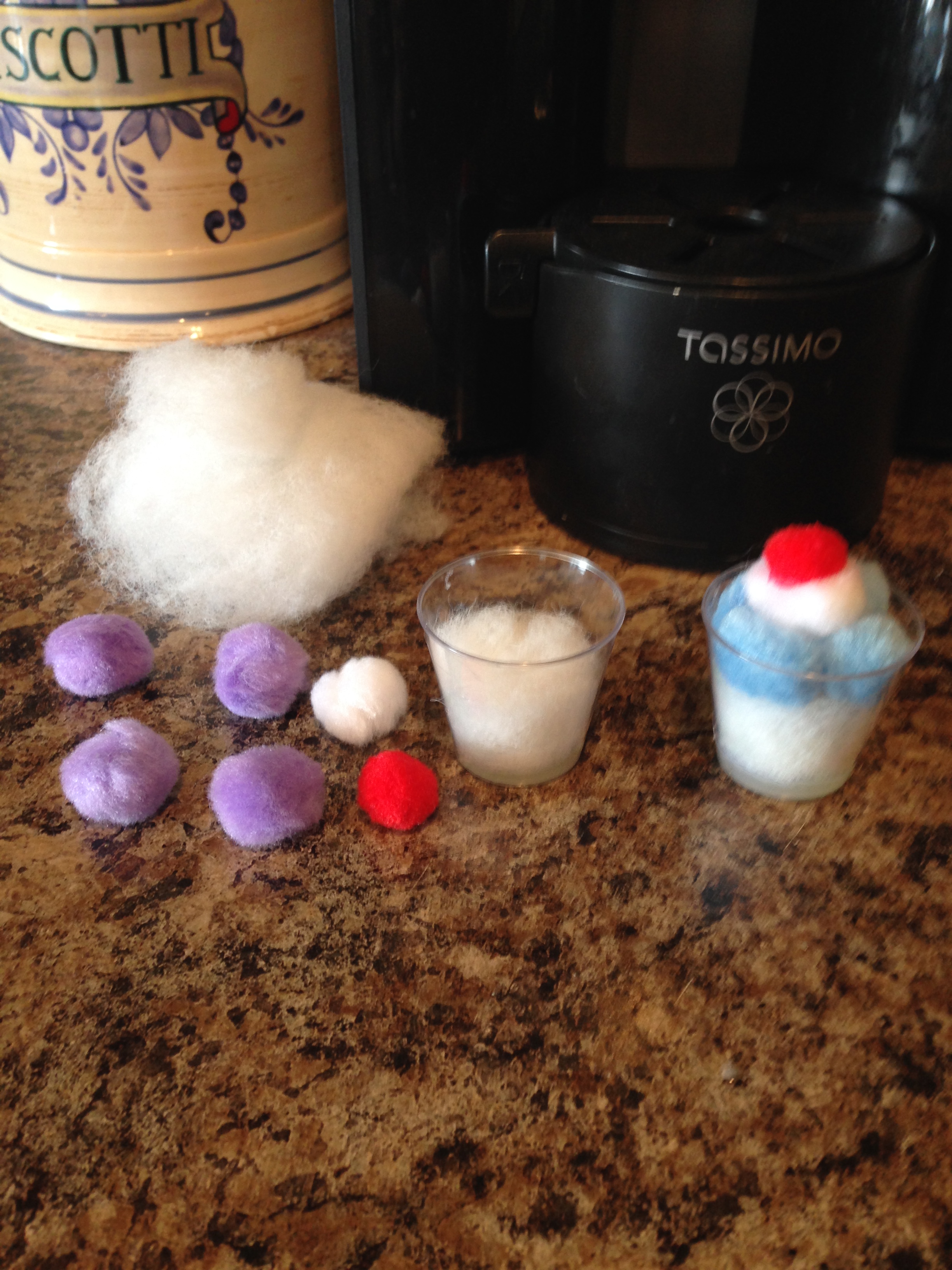 First gather your supplies. Then put a layer of hot glue at the bottom of your glass. Stuff a little bit of poly fill, or a couple of cotton balls into the hot glue. Glue four coloured pom poms on top. The white pom pom is the whipped cream and the cherry on top is a red pom pom.
