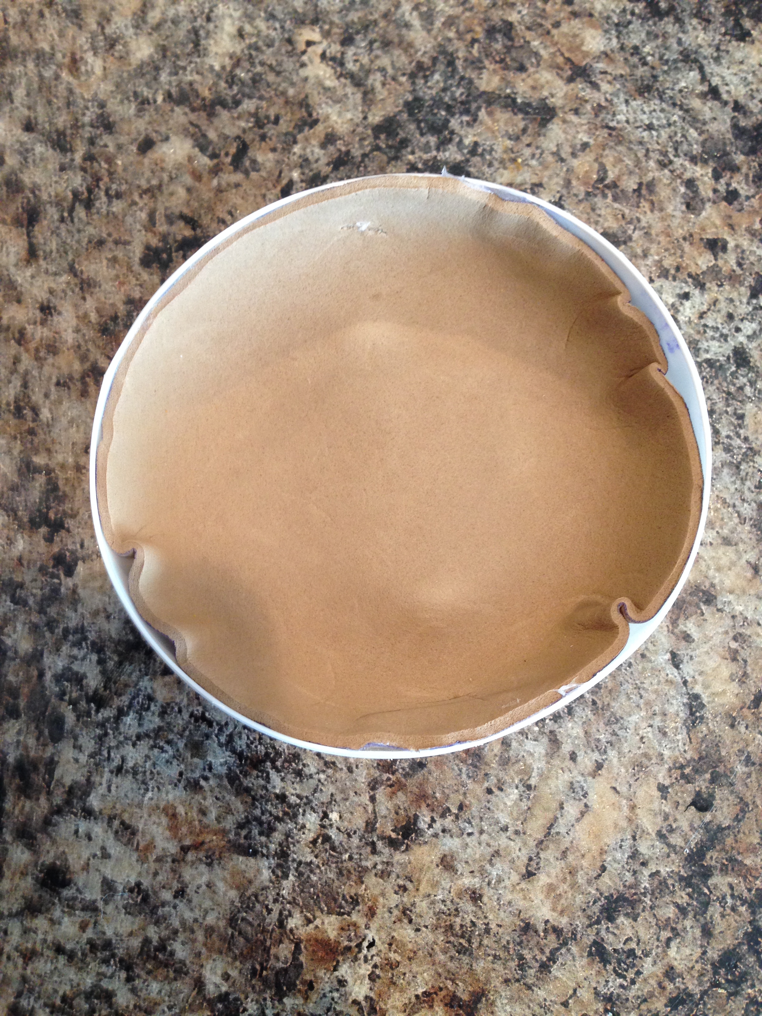 Insert a strip of tan craft foam to create the edge of the pie. Glue it in. Then fold it down and glue it all the way around to cover the top of the dish.
