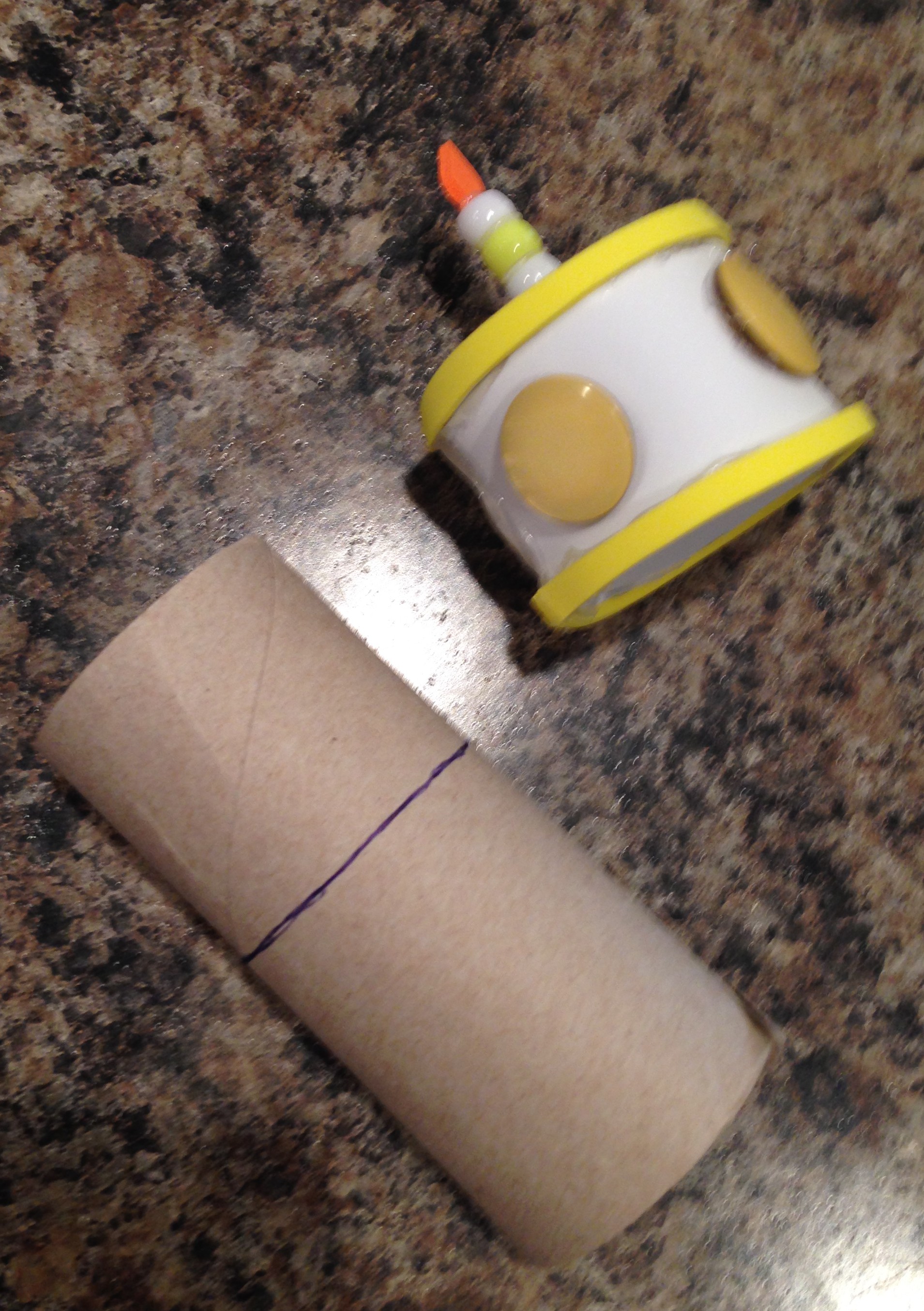 Next up is the birthday cake. It was quite easy to do. Just take a toilet paper roll and wrap it up in white craft foam. Cut it down to size. Then add two white circles, one on the top and one on the bottom.