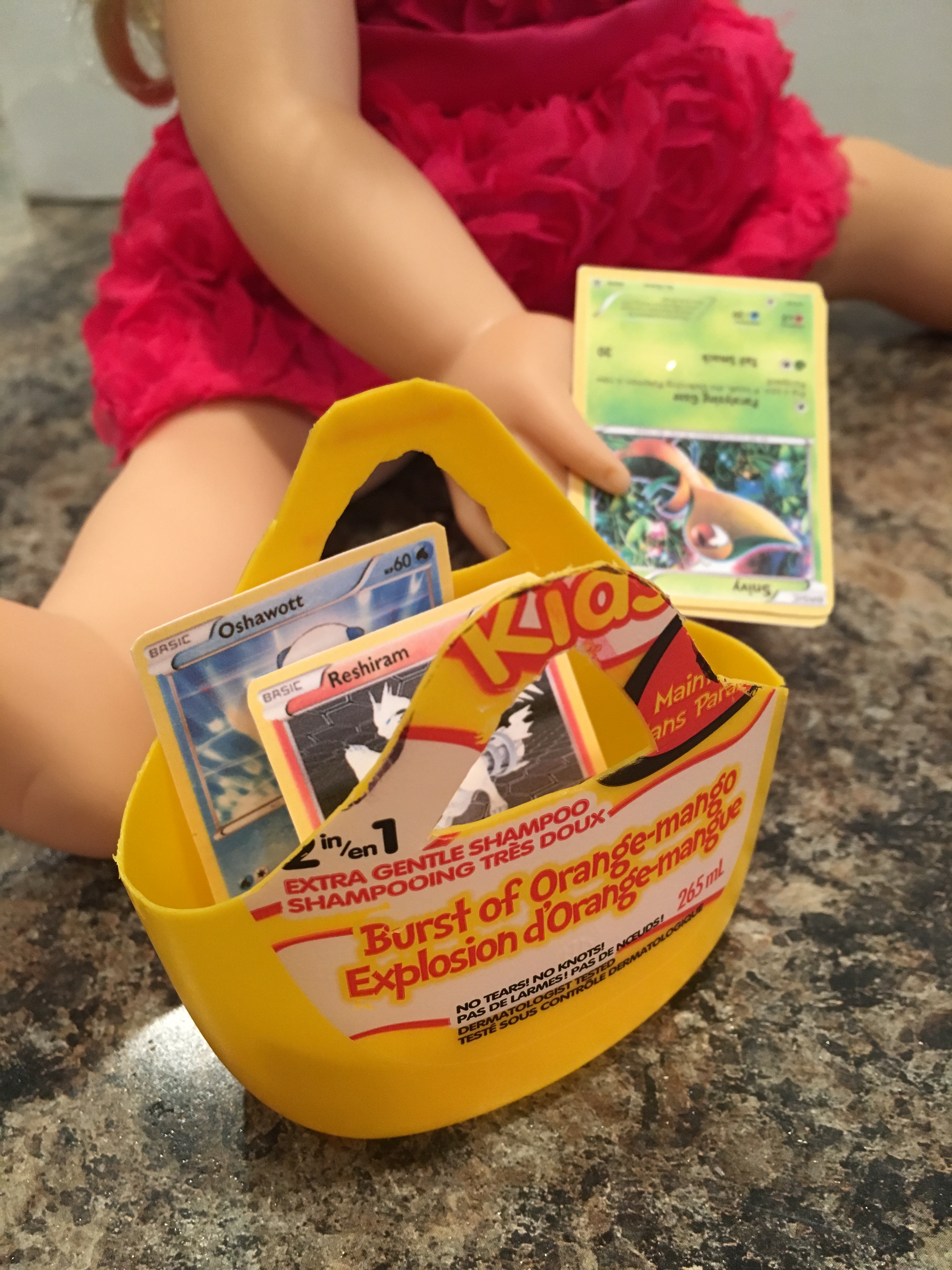 We made a little carrying case for the cards out of an empty shampoo bottle. I was going to make a cardboard card package, but I know how long that would have lasted. I also knew that if we wanted to make more cards, they might not fit inside the box.