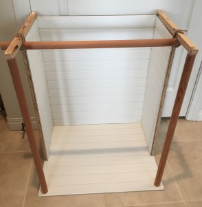 Lea’s Rainforest House has three walls and a floor. The front is open for play. Bead board is great for this project because it has a finished surface. It is also quite lightweight. I didn’t want to create something that was too heavy to move. However, bead board is thin, so you can’t realistically attach it to itself.
