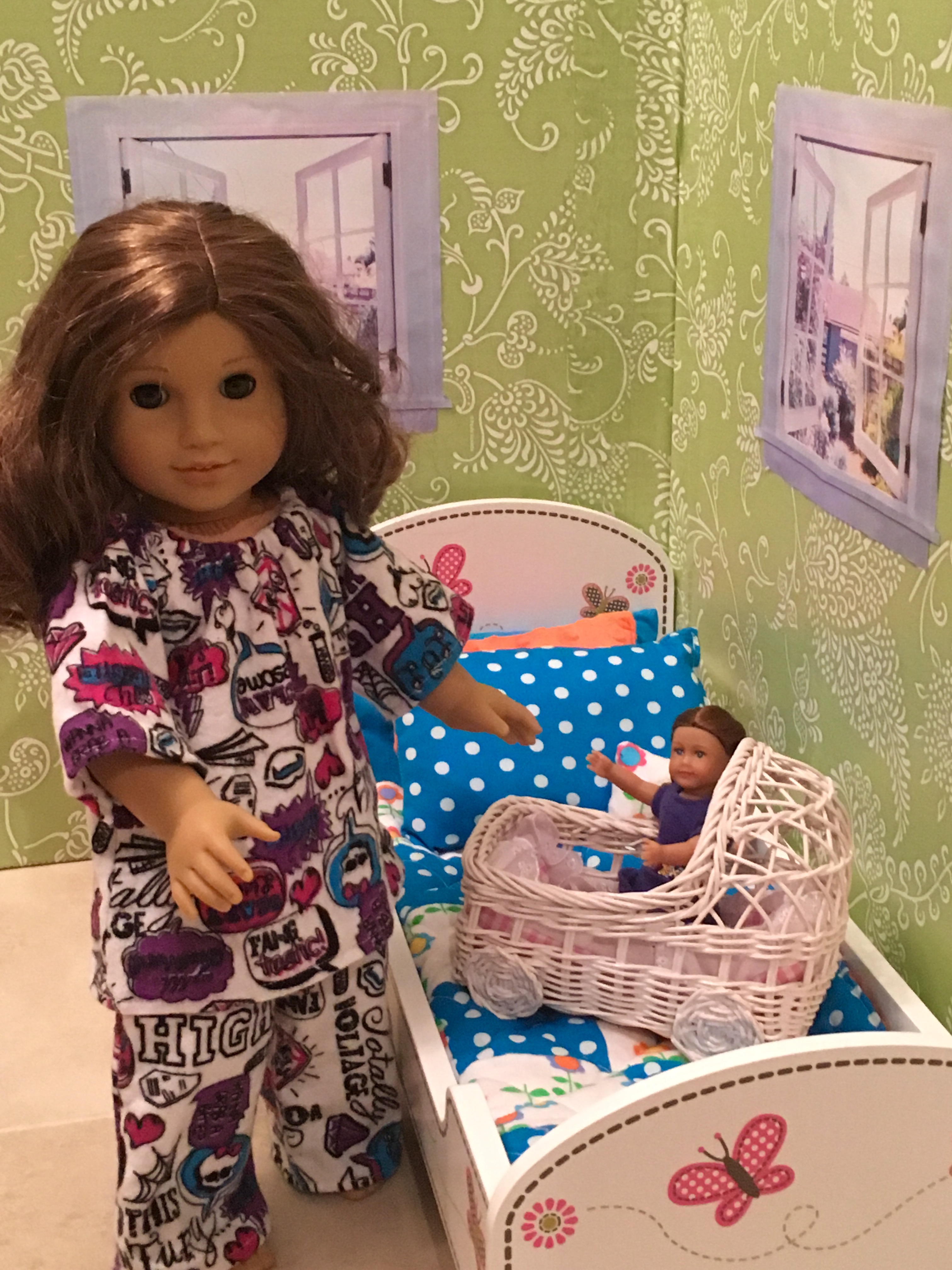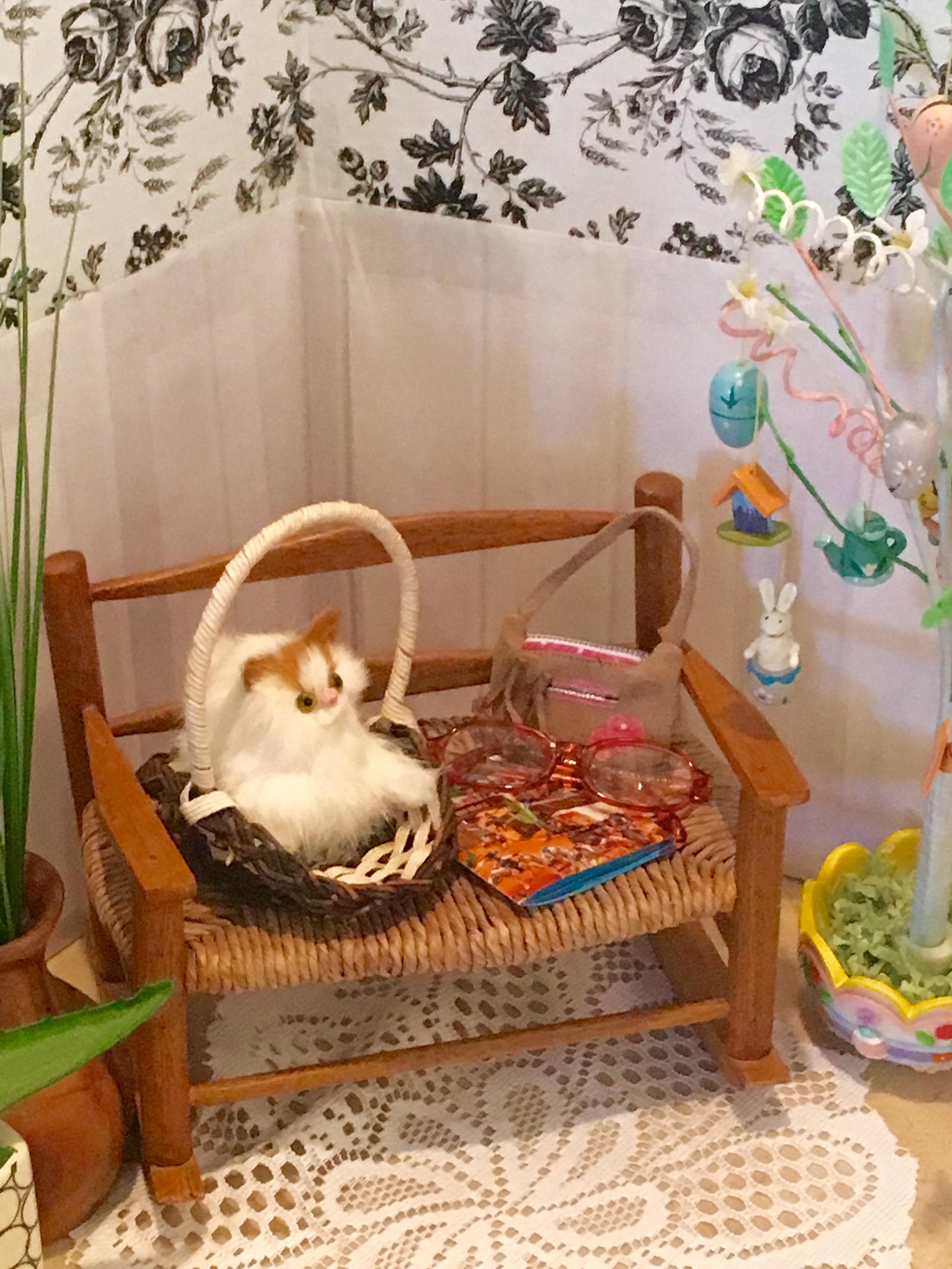 Here are some close up pics of the first room. I decided to feature Rebecca today as her birthday is coming up right away. I found the gorgeous little wicker bassinet for the mini dolls at a thrift store. ❤