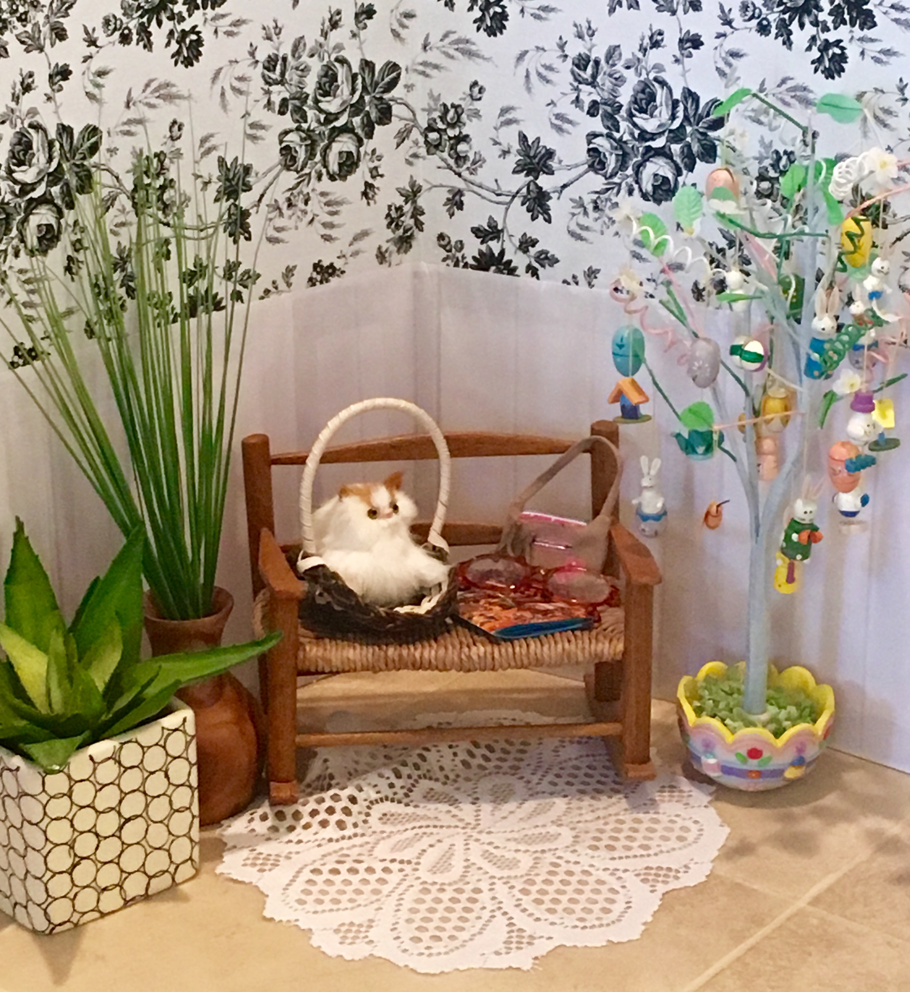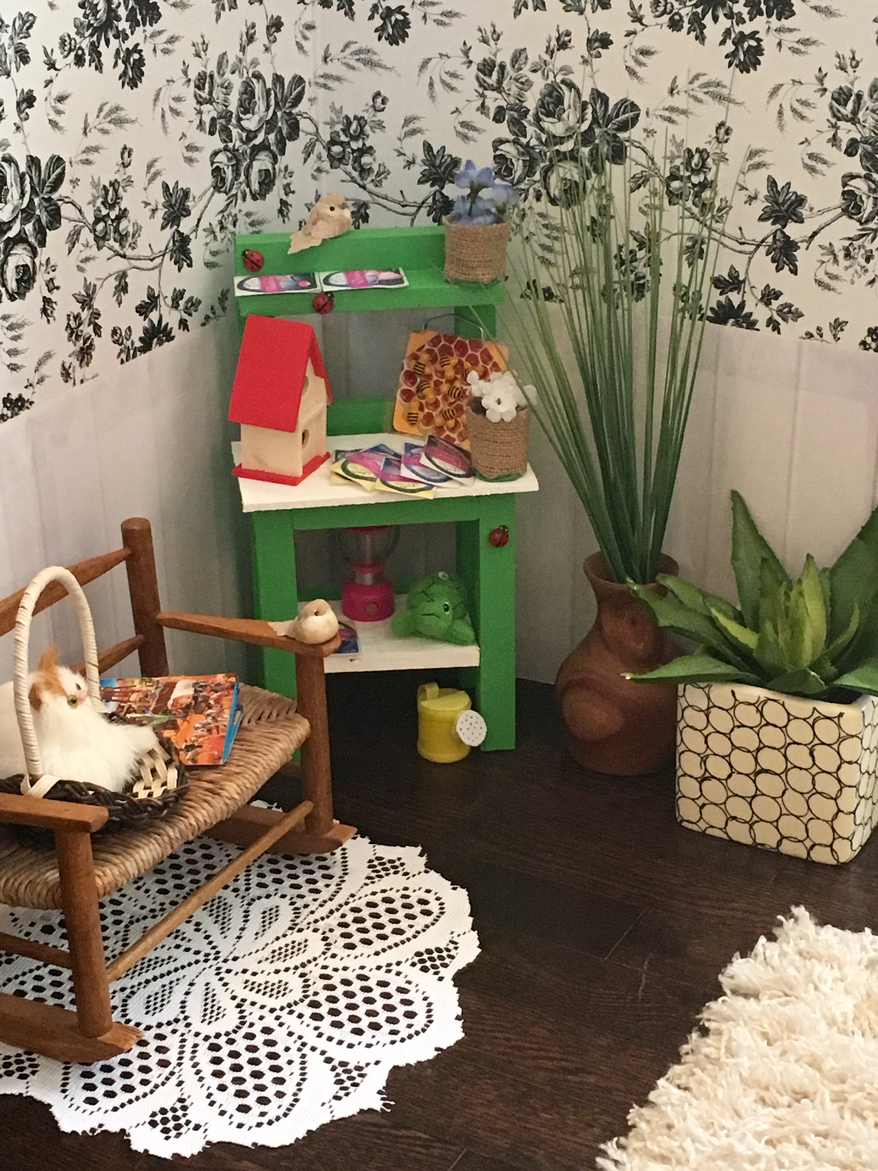 Here are some pics of the second room we made. I was thinking that this one could be used as a dining area, but for now I just used this cute little bench that we found at a thrift store.