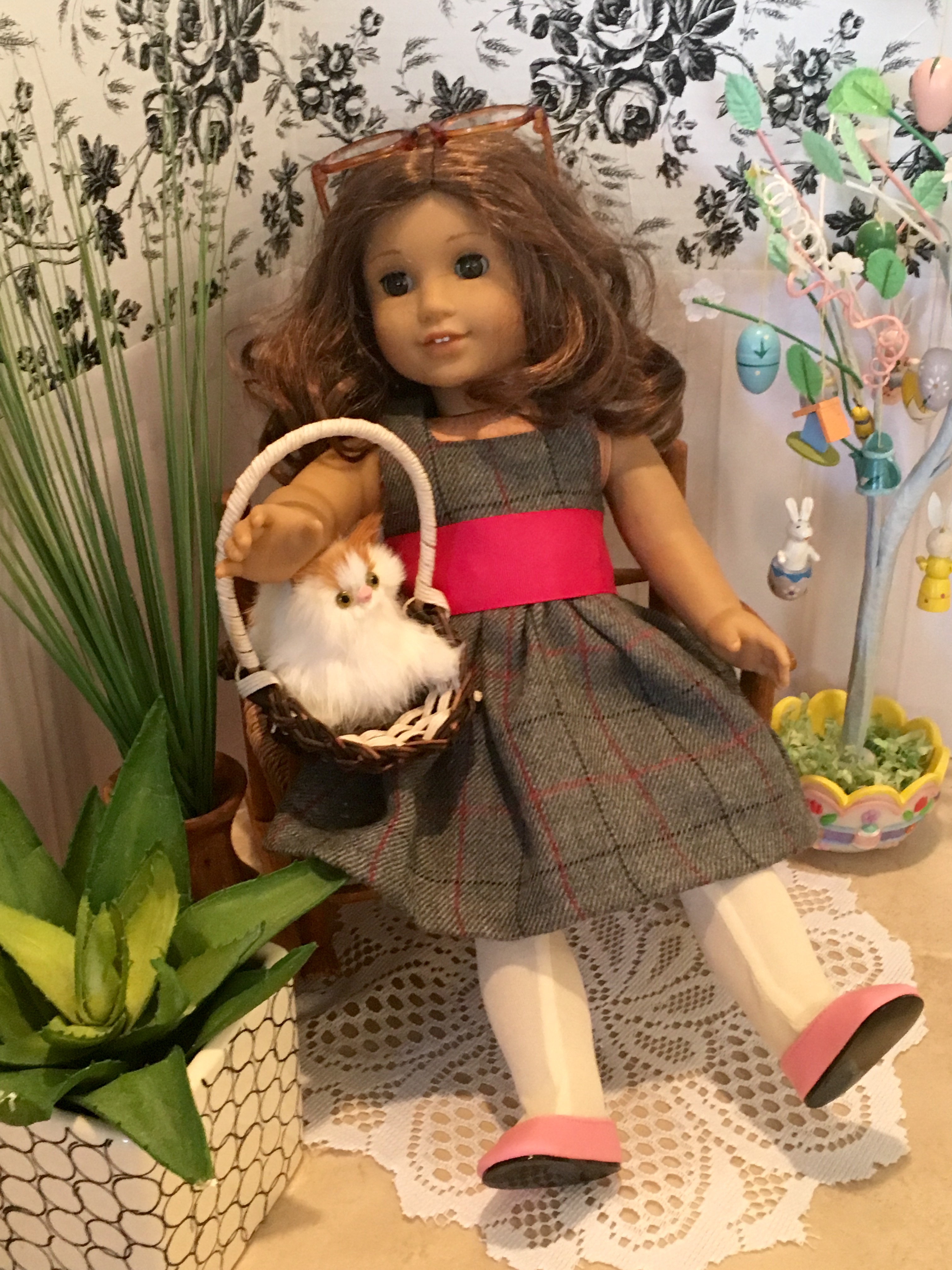 I added a wide ribbon to Rebecca’s dress for a pop of colour. It works nicely as a sash. I just pinned it on there for now.