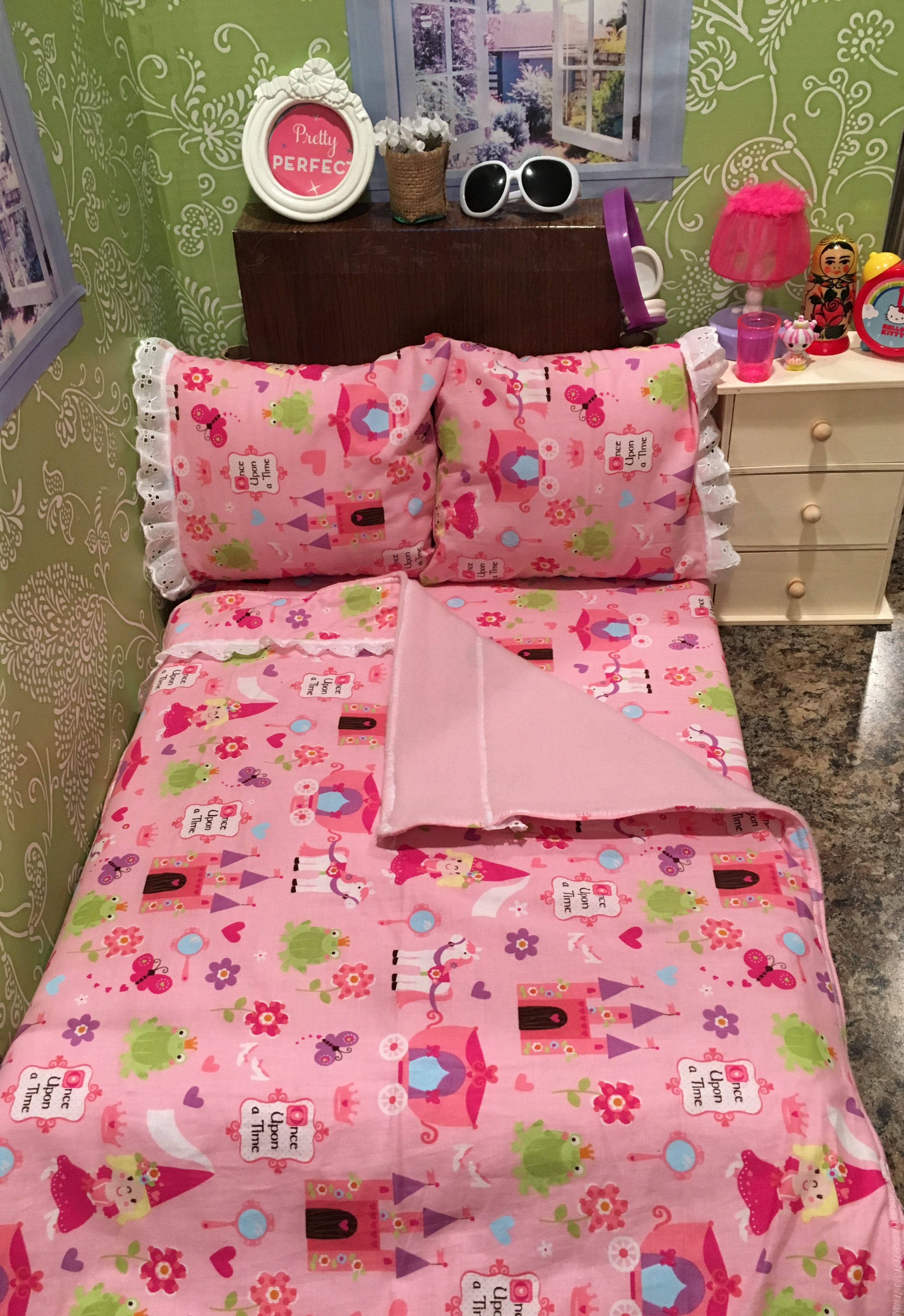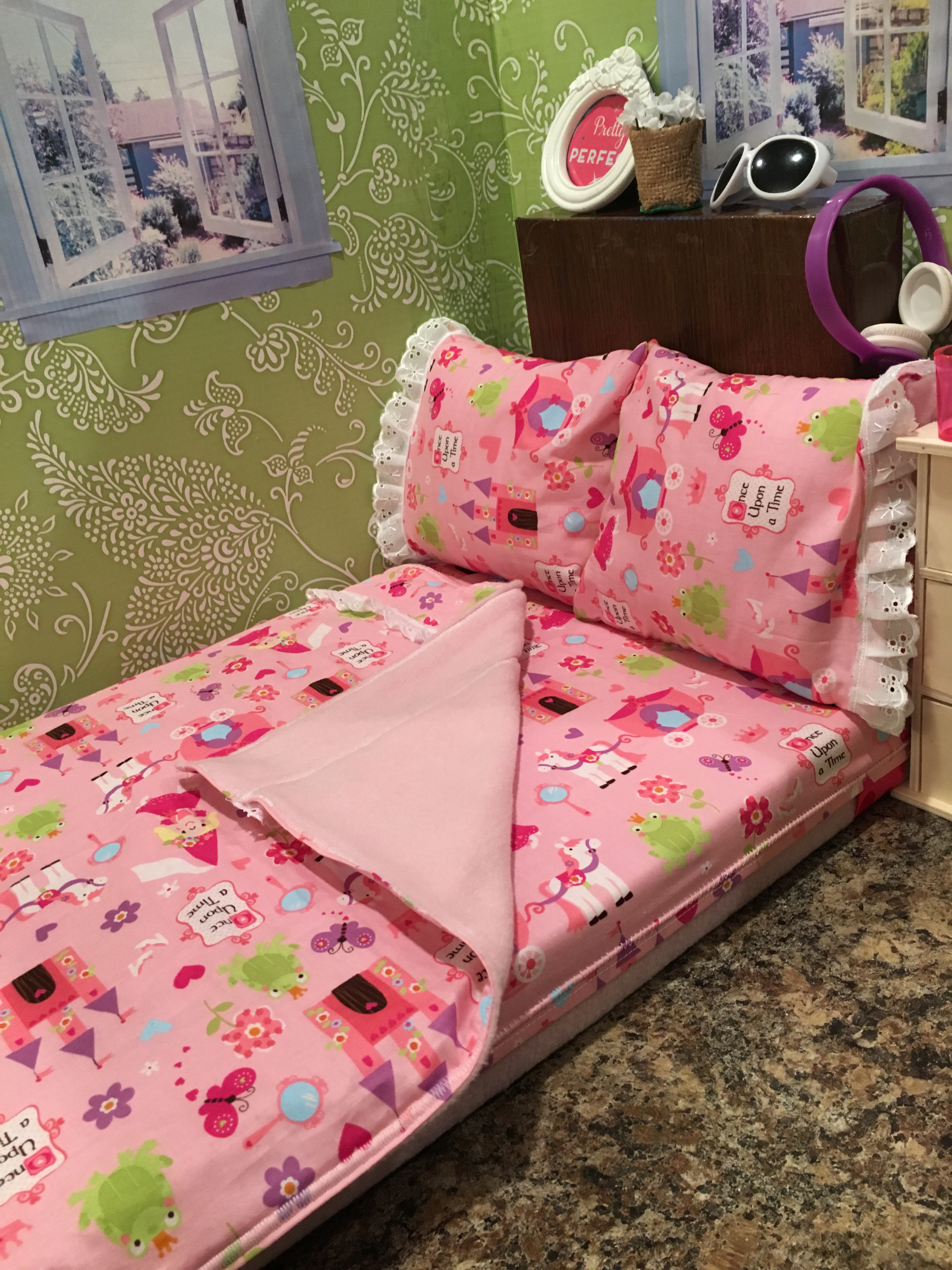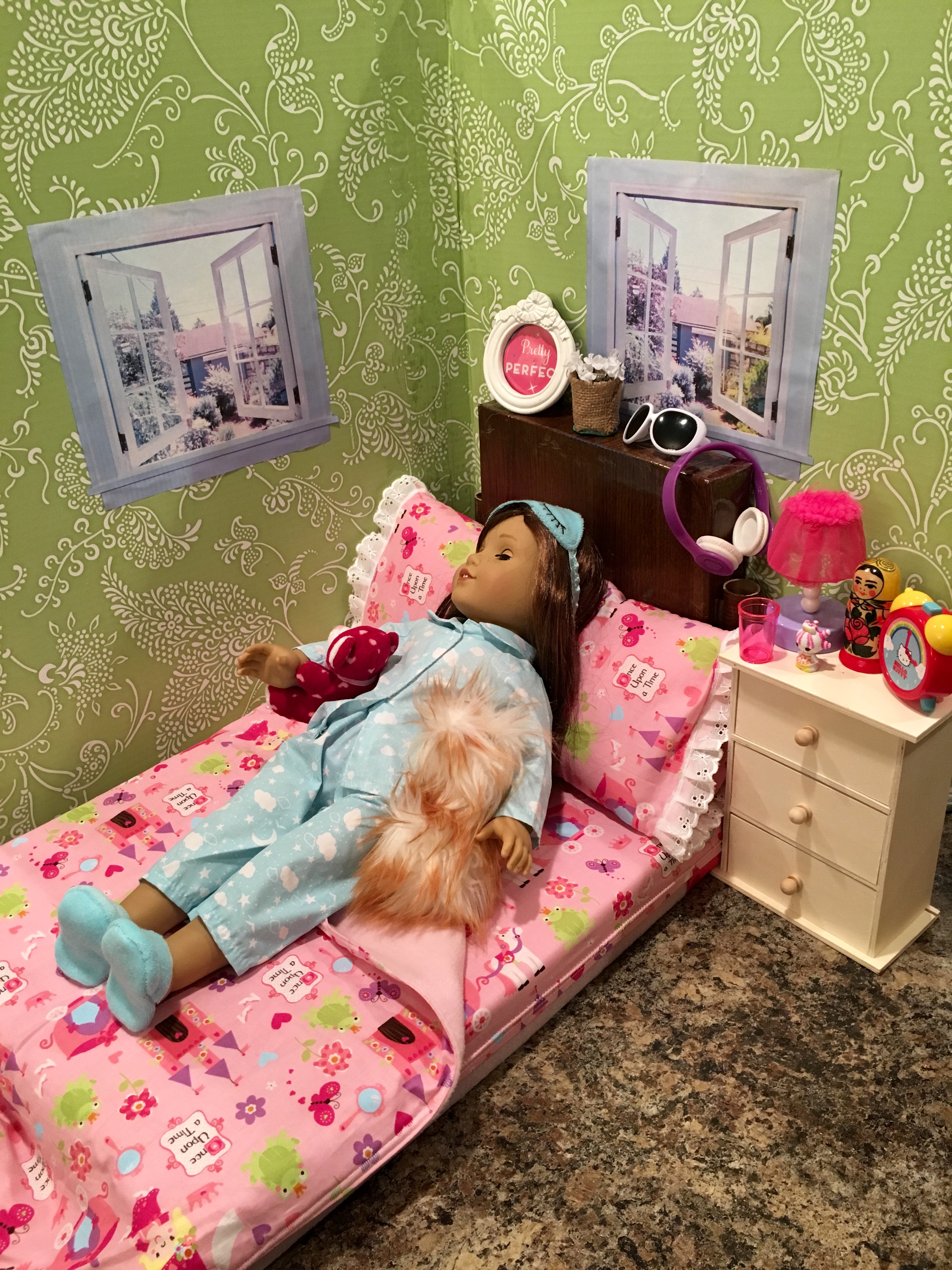 I made all the bedding as well as the bed and the headboard. This bed is usually in the dollhouse, but I decided to pull it out to feature it today.