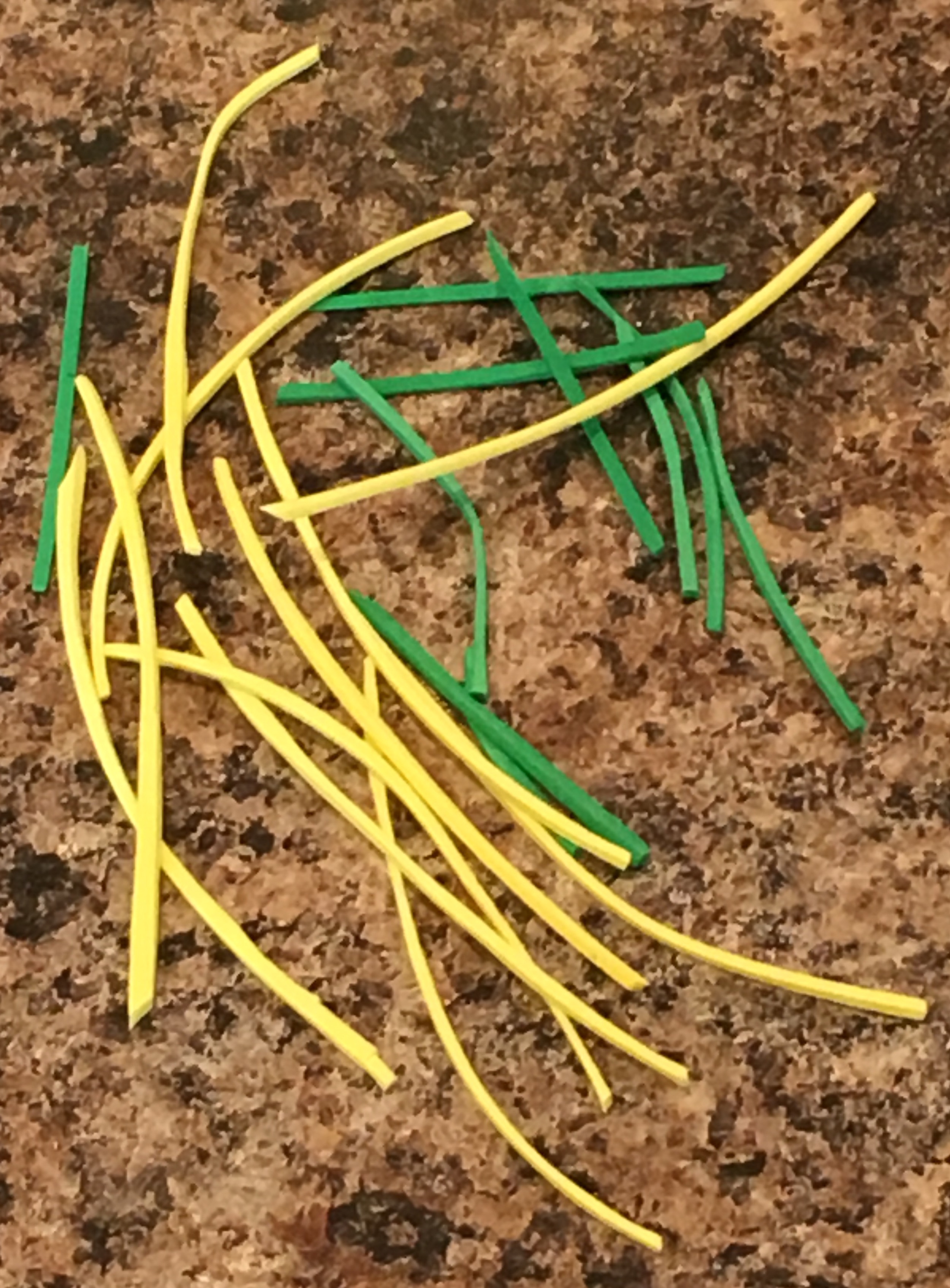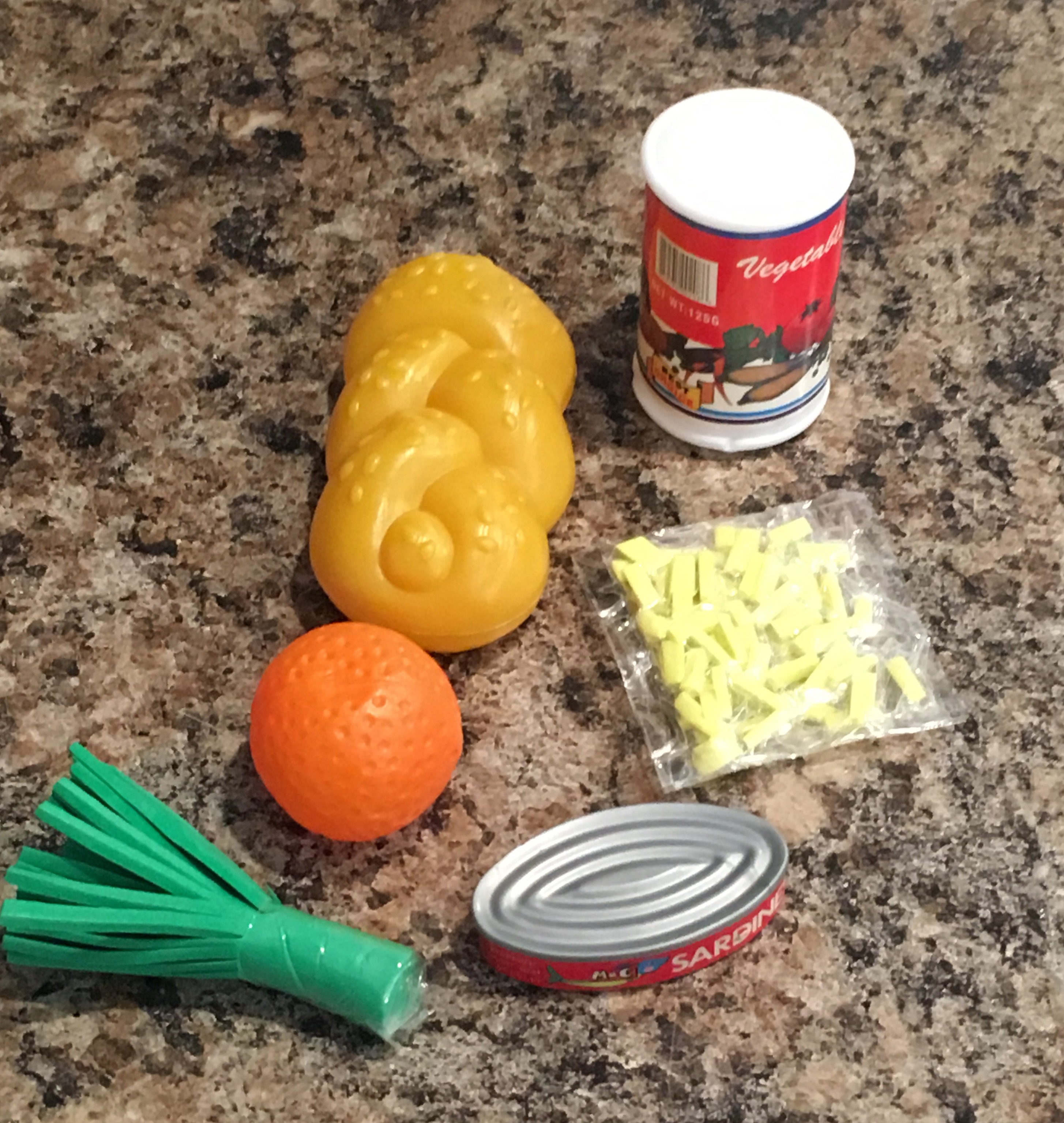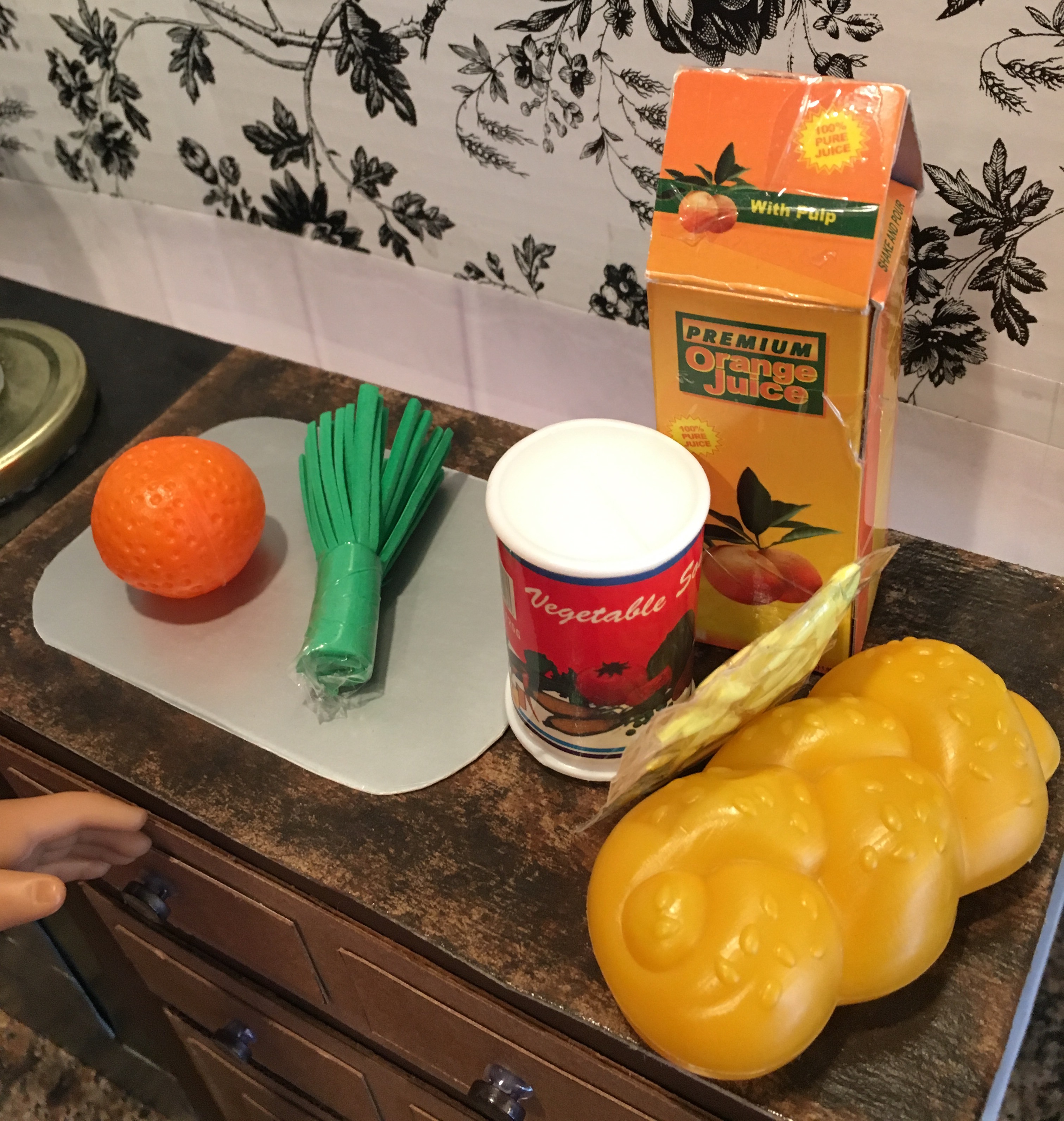 The food is from a plastic play food set except for the green onion and the soup noodle packet. I made those out of craft foam.