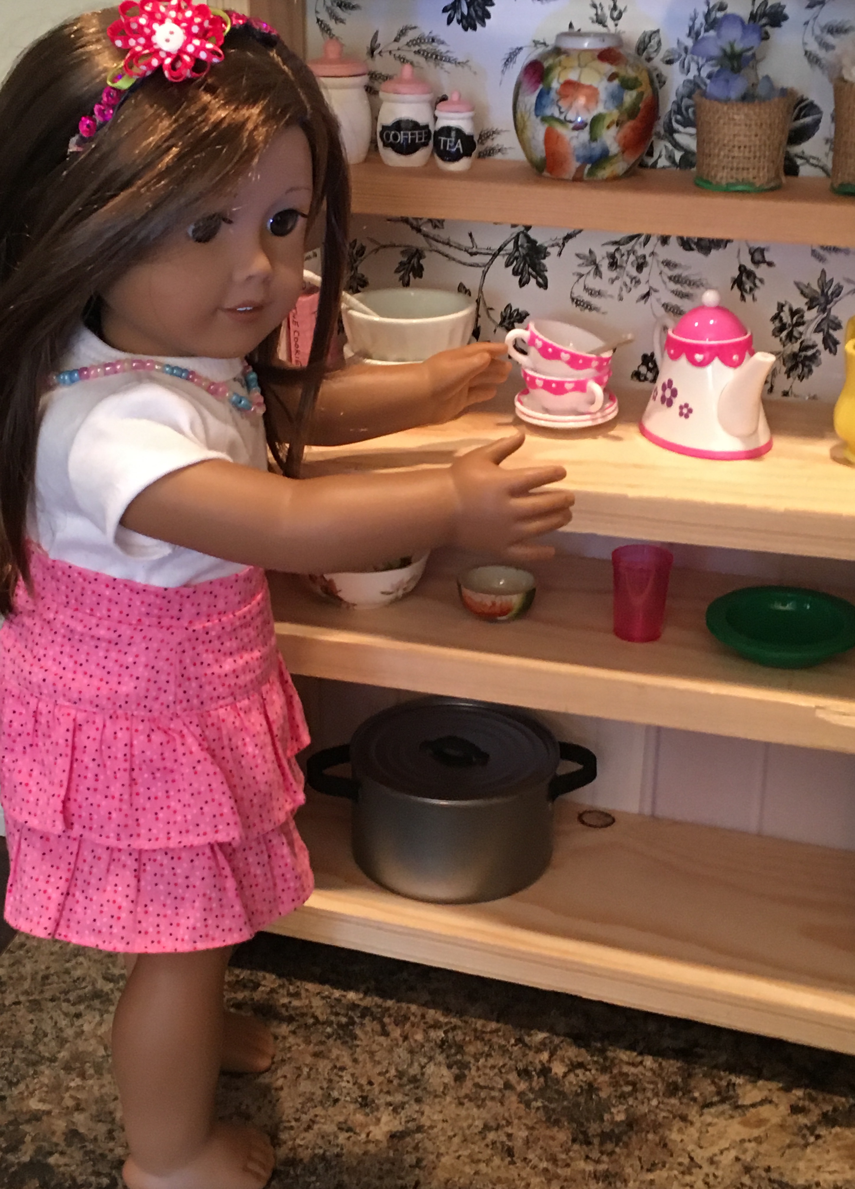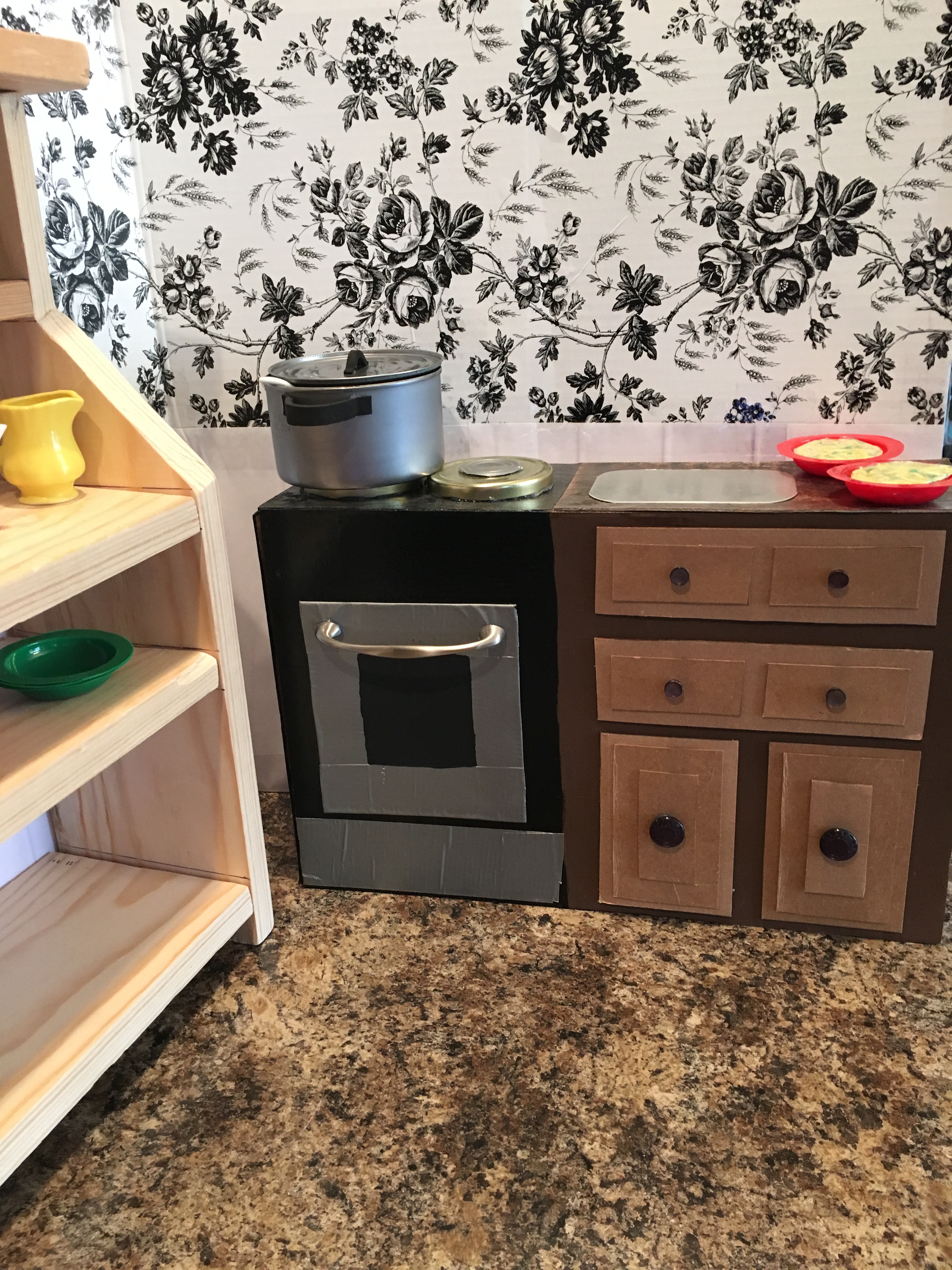 The hutch I built myself, while the cabinets and stove combo are from our dollhouse.