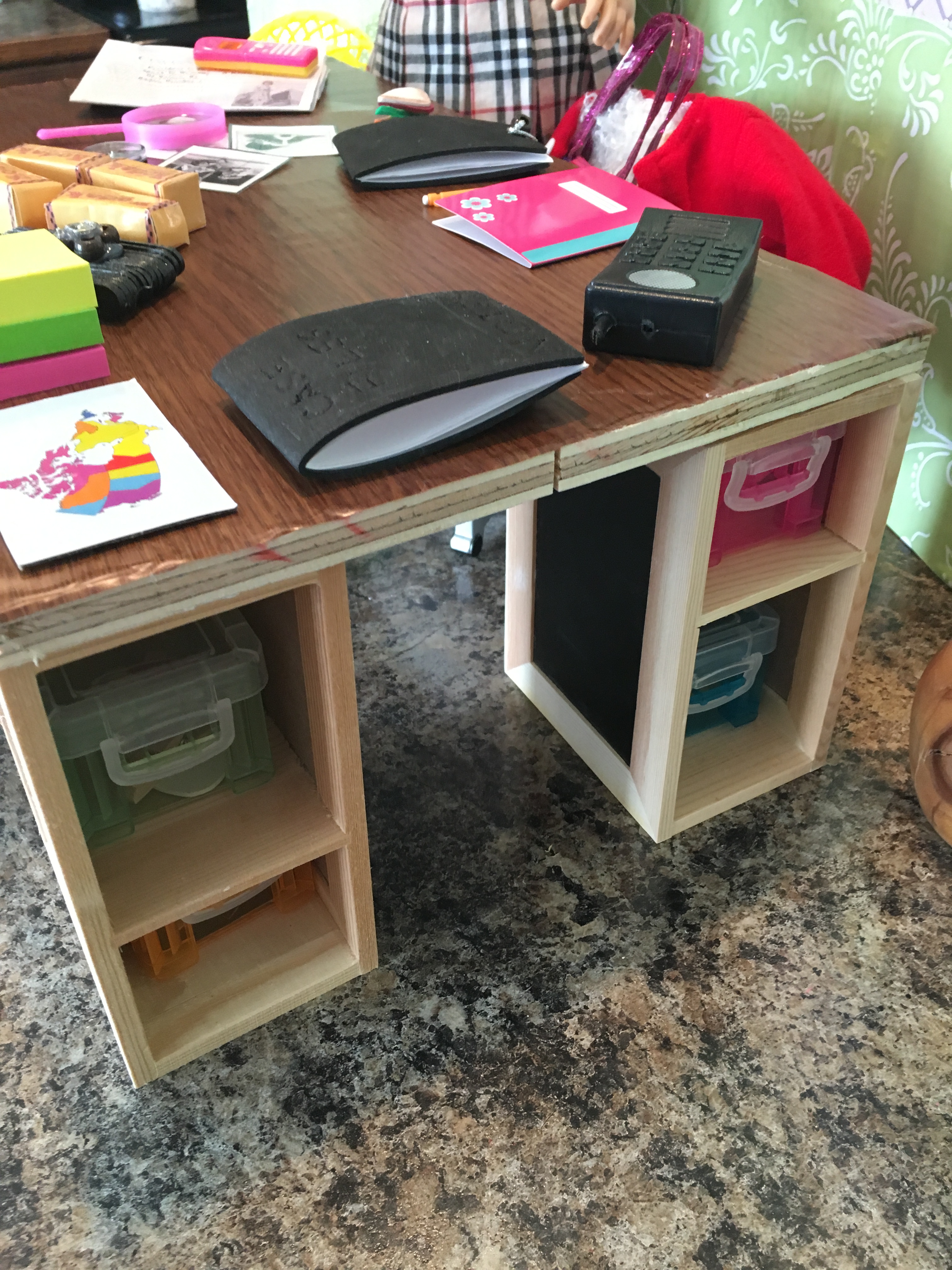 I made the desk out of a plastic set of drawers and some wooden boxes from the dollar store. I just laid a piece of wood across.