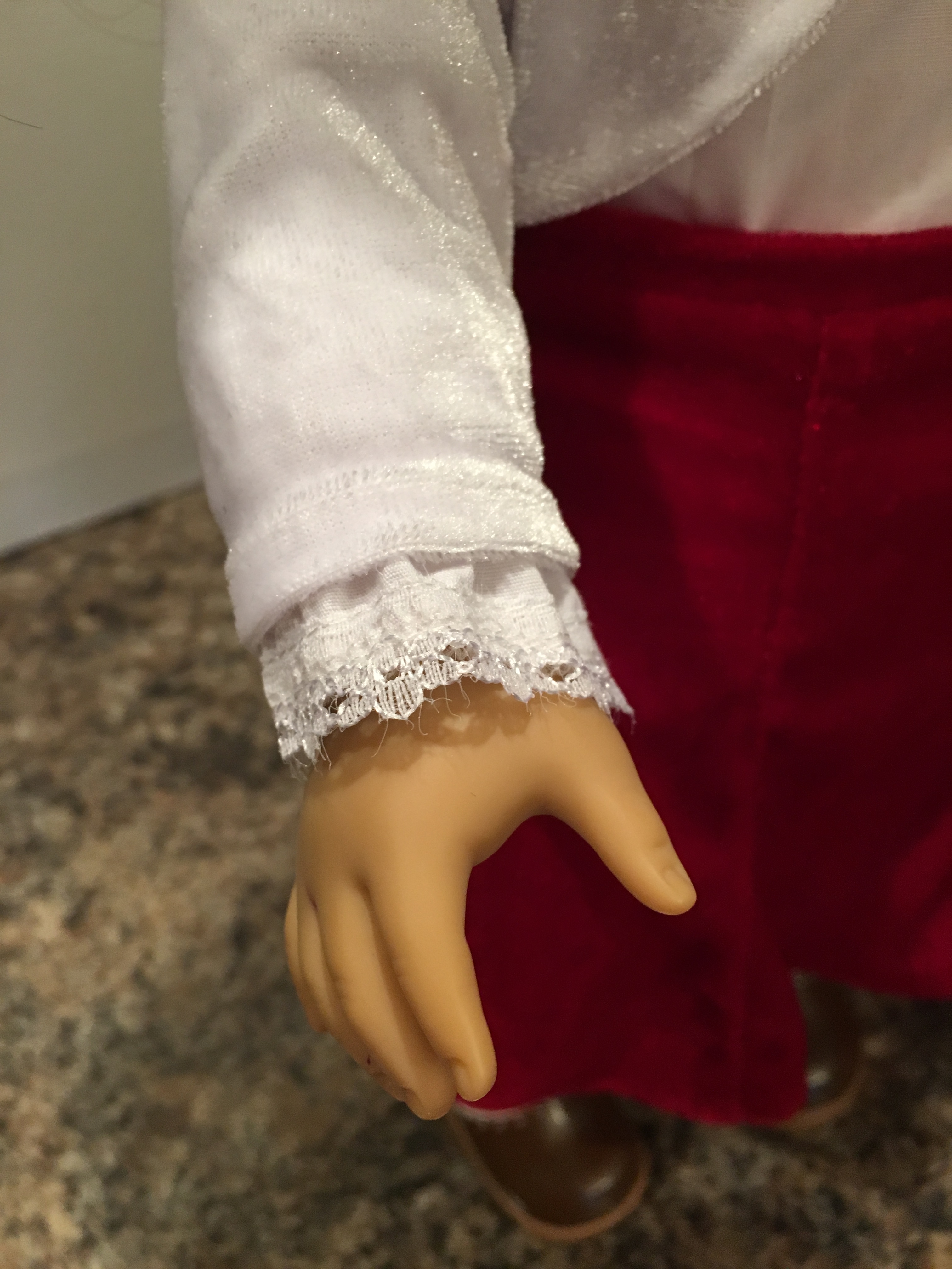 The sleeves of Rebecca’s collared shirt have these pretty little lace cuffs. I just had to showcase them by having them extend out from the bottom of the shrug sleeves.