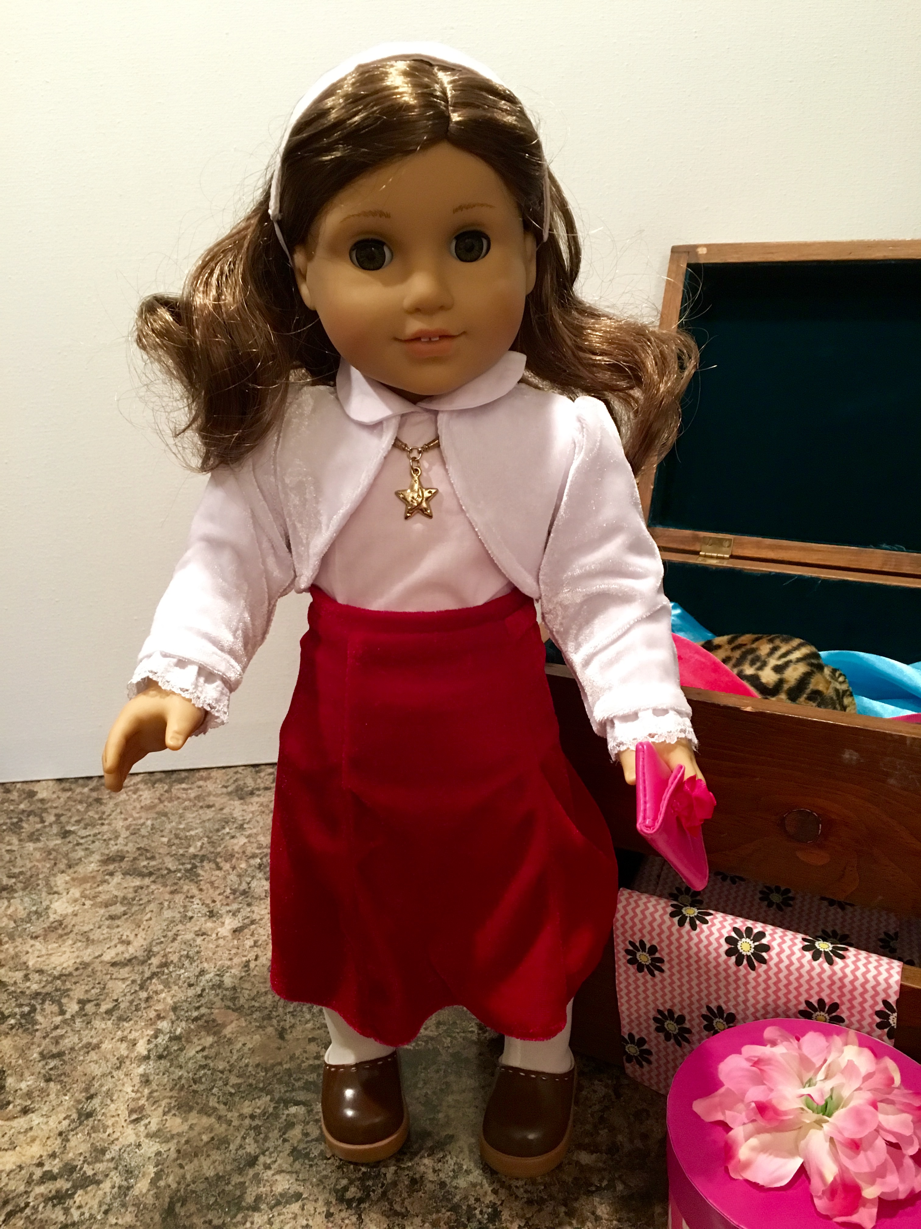 Rebecca’s white shrug is a Newberry doll buy from Sears. Her velour skirt was among a large lot of doll clothes that we received a while back, along with the collared shirt. Her pink purse is Our Generation and the white tights are AG.