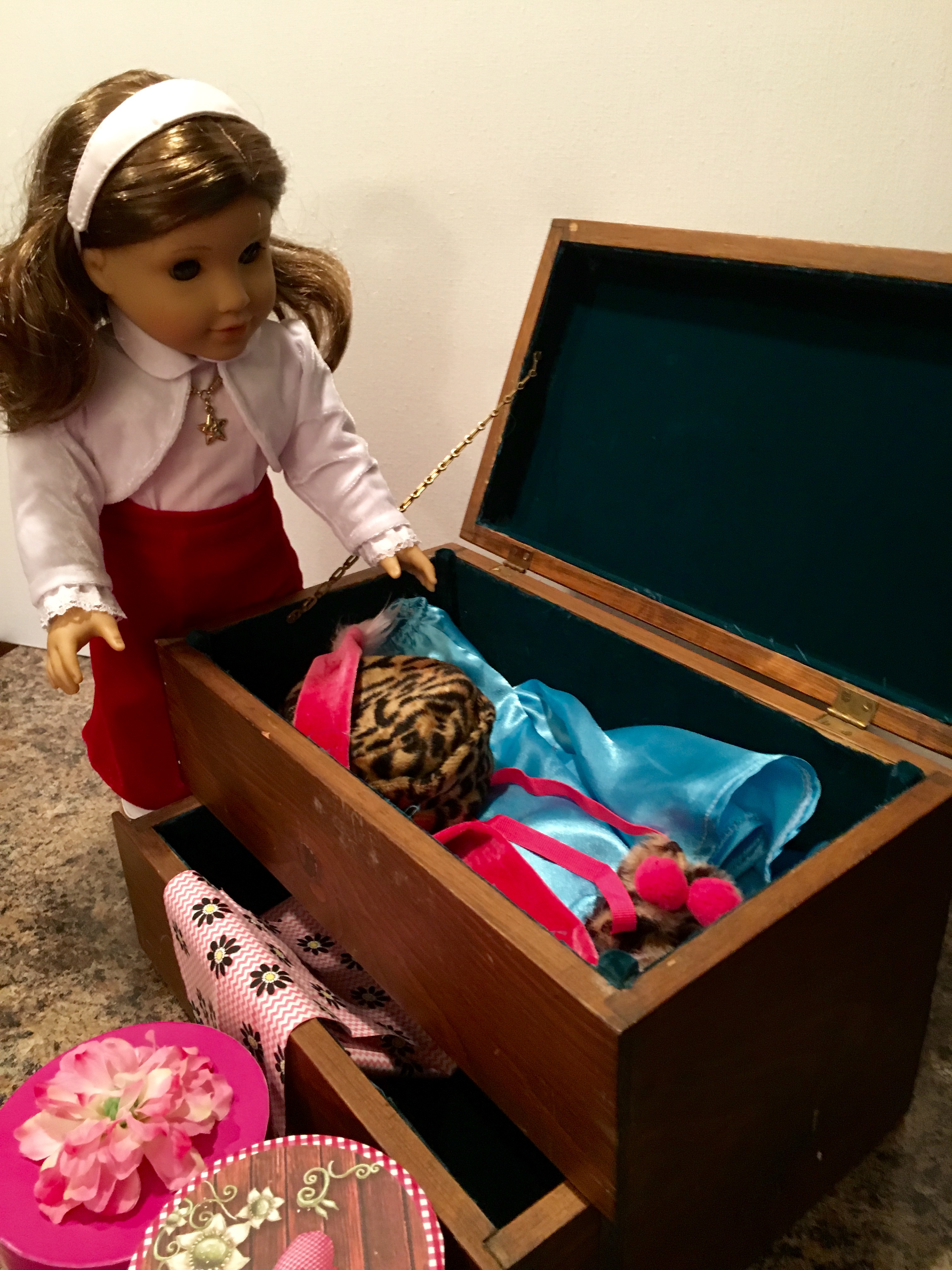 Rebecca’s trunk is a favourite thrift store find. It is perfect for storing all of her dress up items. It has a hinged lid at the top and a nice big drawer on the bottom.