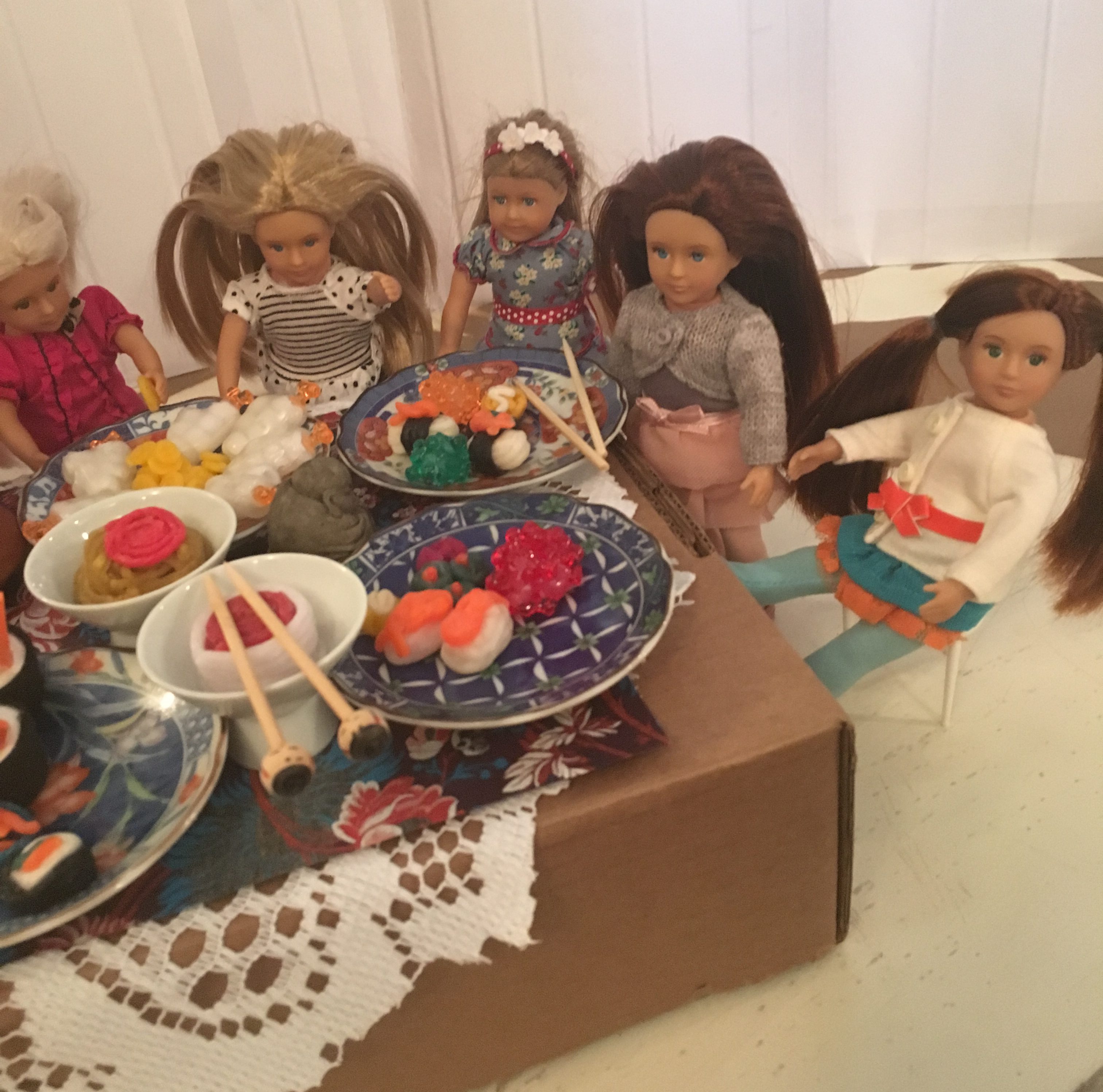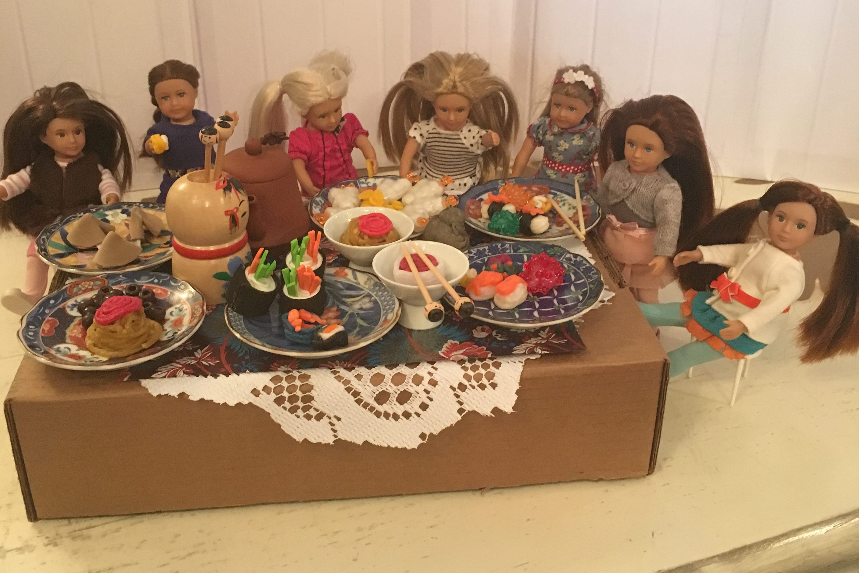 They all crawled up on the table, and got into the Japanese doll food buffet!!