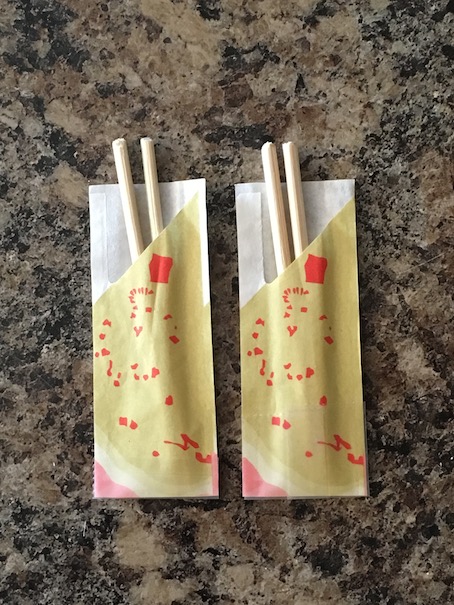 Simply measure and cut the top ends off of the chopstick wrapper. Be sure that your chopsticks will fit! Then all you have to do is tape the bottom closed!
