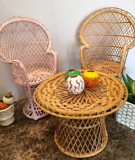 We found this little wicker table at a thrift store. I had the two chairs already, so it was a perfect match. Actually, we found these two chairs at separate thrift stores.
