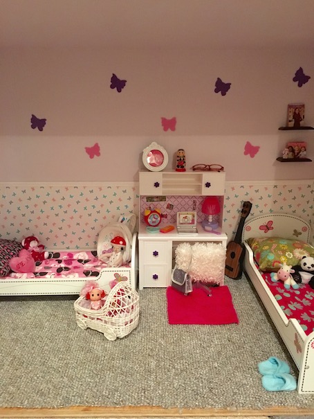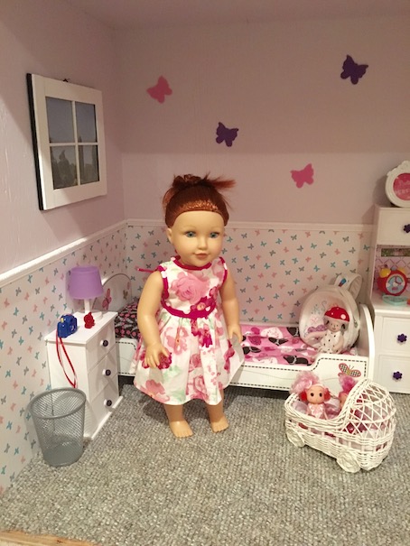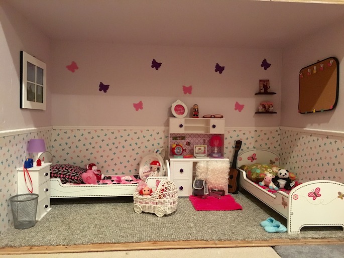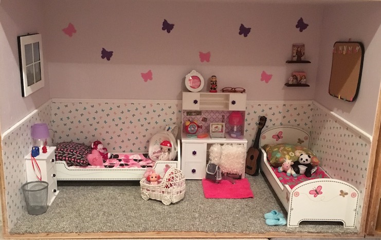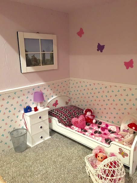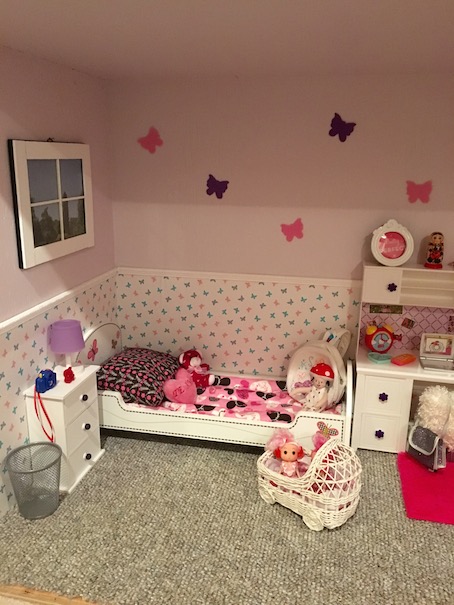 I also used an adorable butterfly contact paper that I found at a yard sale for the wallpaper. Doll wallpaper is hard to come by, so I was happy to find this. Β πŸ™‚