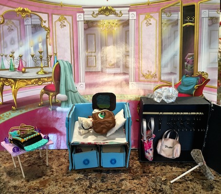 This Littlest Pet Shop bedroom comes equipped with a lovely blue bed with trundle drawers, a unique purple night table, and a closet with tons of hangers to spare.