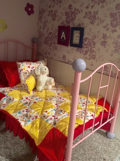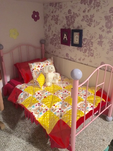 We got these little beds for five dollars for two from a garage sale! I made the bedding myself except for the bedskirt and the mattress. I bought those from Maplelea.com.