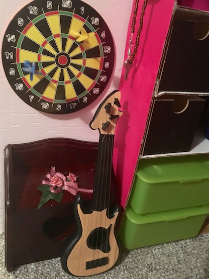 I made this bookcase out of cardboard. It is actually pretty sturdy. I just love how much fun is going on inside it! There are tubs and buckets and bins of toys and stuffed animals as well as a soccer ball and a frisbee. I will probably put more of our doll’s sporting equipment in these bins.