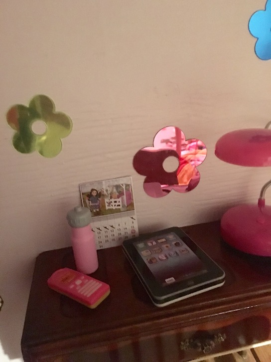 The little mirror decals on the wall are more dollar store finds! Also, the lamp really lights up and the iPad makes sounds!