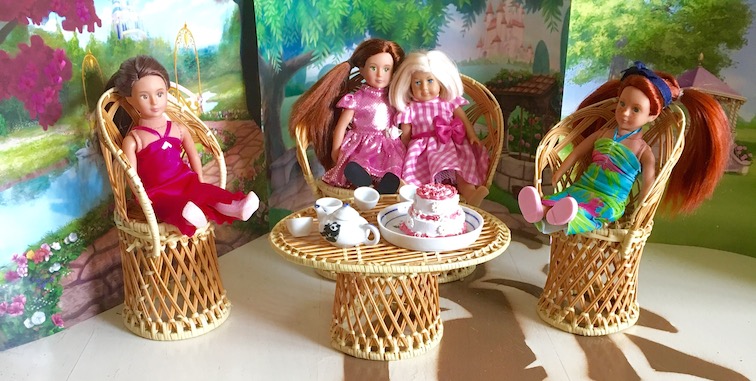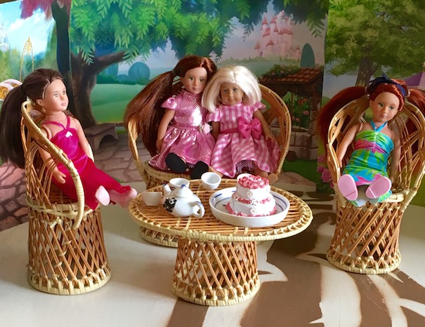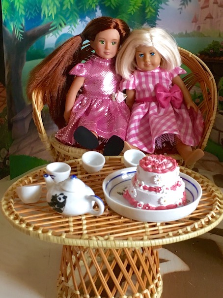 **We found the two mini doll party dresses last year on Amazon, and the cake is from the Queen’s Treasures. 🙂