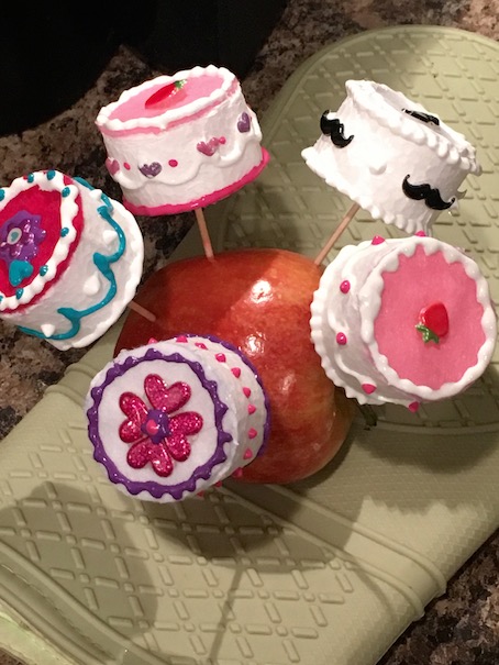 Next take your puffy paint and decorate! Stick your cake on a toothpick so you don’t smear your work.