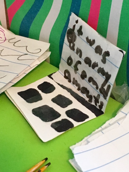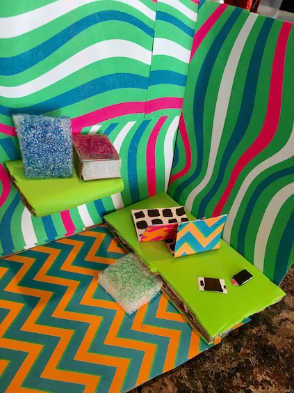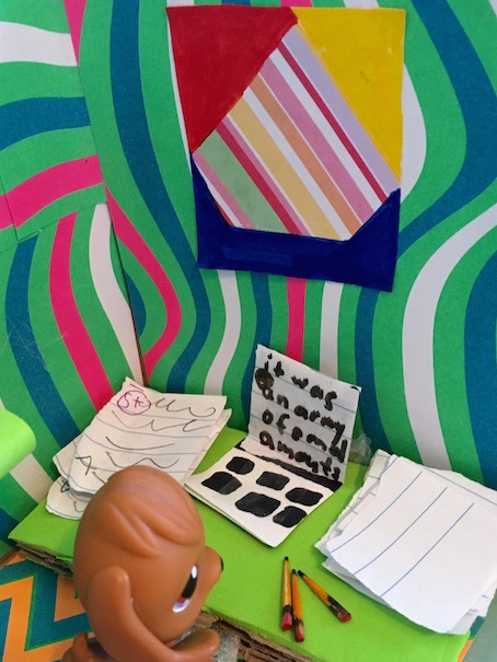 The full room is made out of a cracker box. The walls and floors are lined with scrapbook paper.
