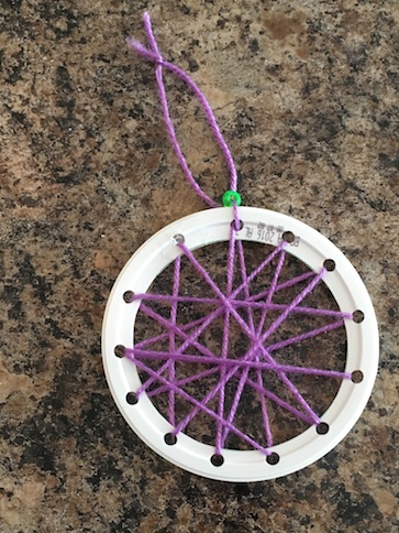 Take your thin yarn or string and start weaving it in and out of the holes. At this point you could start stringing beads on if you like, but we didn’t. We saved all the beading until the end.