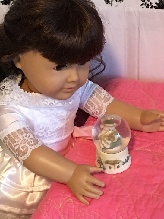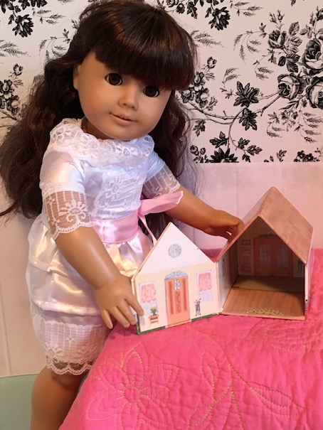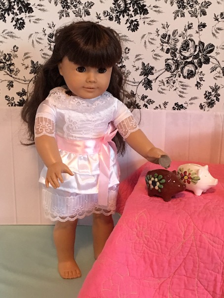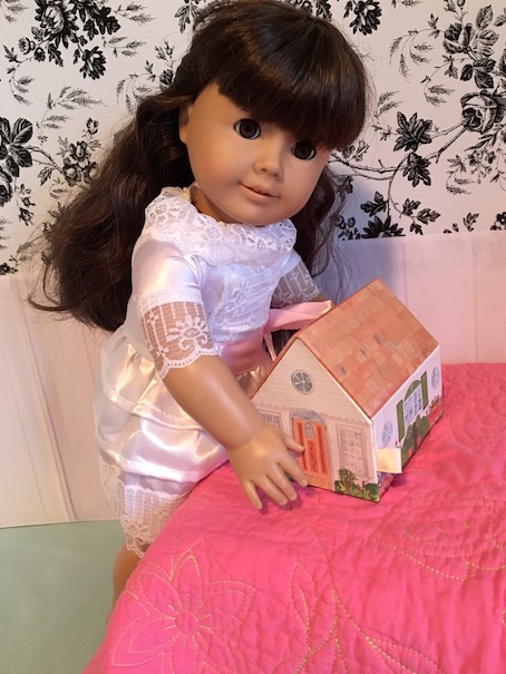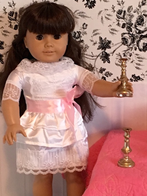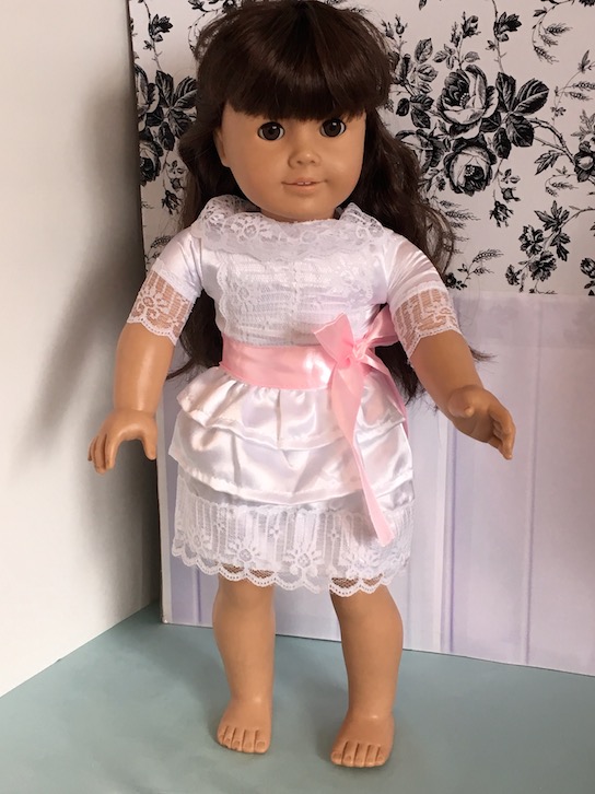 Luckily we found this cute little satin dress on eBay for a dollar. π I find that the sleeves of this dress are a bit too tight for the AG dolls, but it is still cute anyway! I think that it’s very reminiscent of Samantha’s pink satin dress with the purple ribbon.