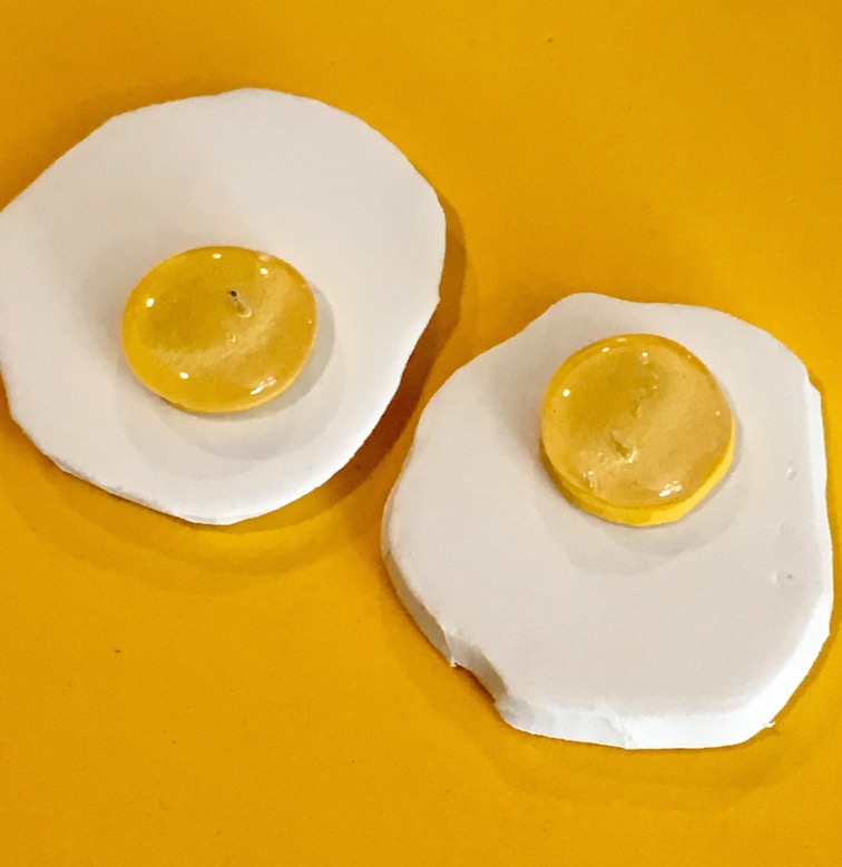 Eggs – Cut egg whites from thick craft foam. Cut egg yolks from thin yellow craft foam. Glue yolks to whites. Be sure to glue them off centre to make them more realistic. Add a blob of hot glue on top of the yolk.