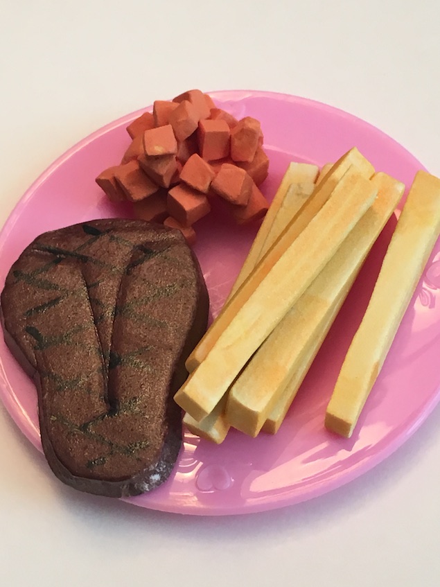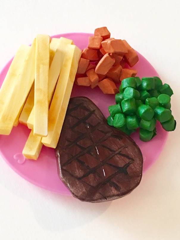 Steak – Cut out a steak shape from thick craft foam. I used the back of a paint brush to make an indent in the foam where I thought that the steak bone would be. Ours are T-bone steaks, so we made a T shape. Colour or paint your steak dark brown. Then use black paint or marker to make the grill marks. We used a bit of mod podge once our steaks were dry just to seal in the details.