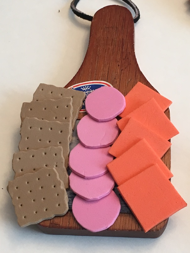 Cheese sliceย – Cut squares of orange craft foam. You could cut other shapes for cheese as well, like triangles or circles. You could also make some swiss cheese slices by using yellow craft foam and punching some holes through. We just didn’t have any room left on our platter. ๐