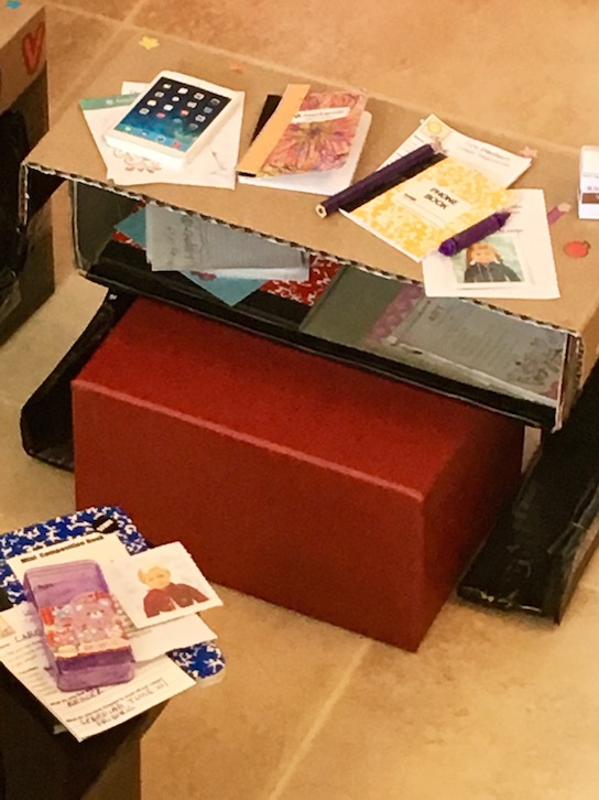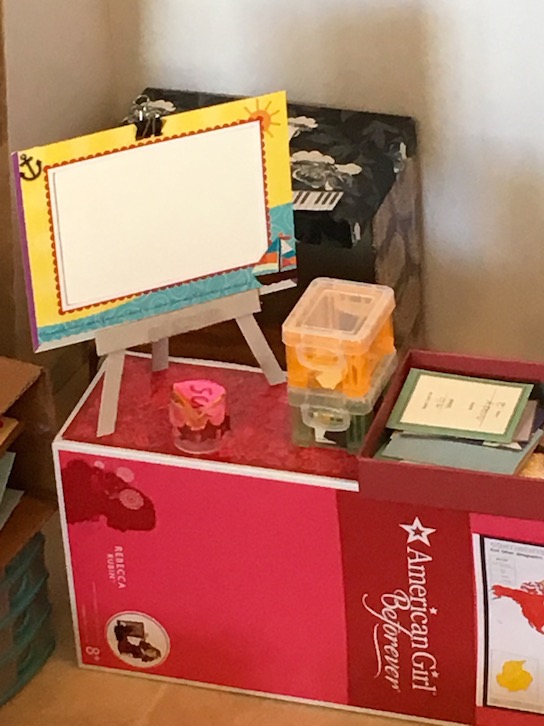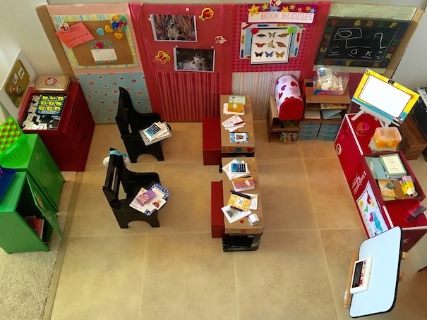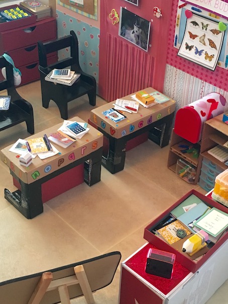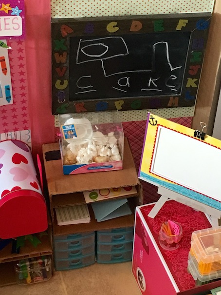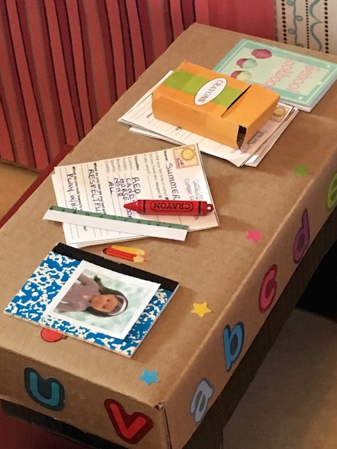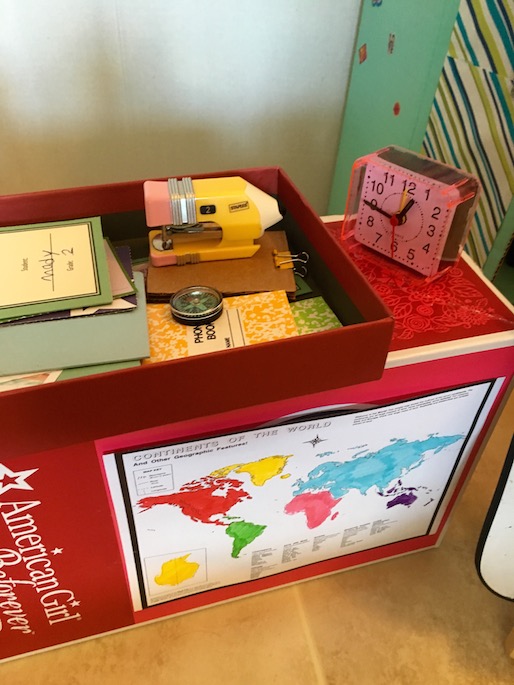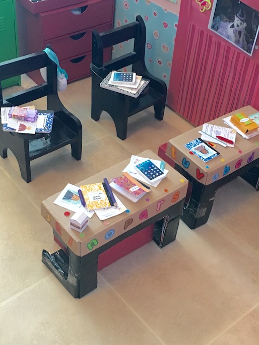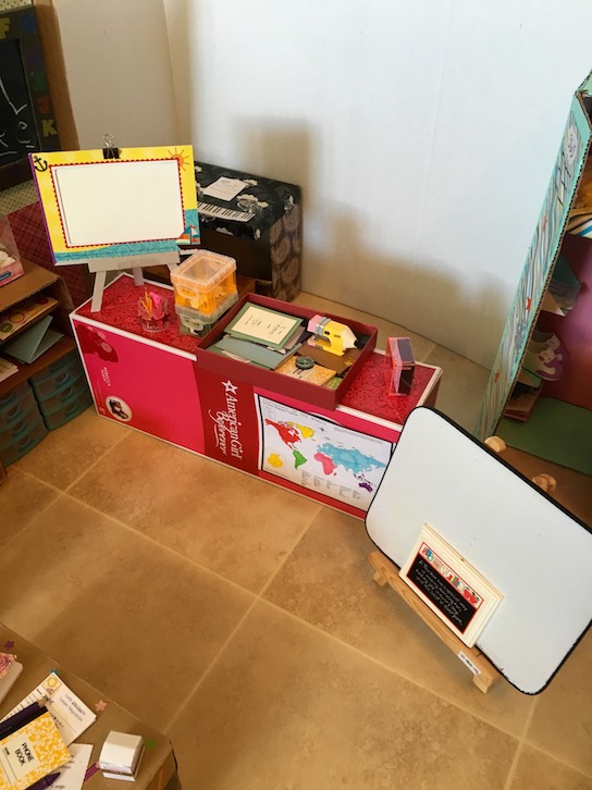 Here’s a look at the teacher’s desk. We made it using an AG doll box.