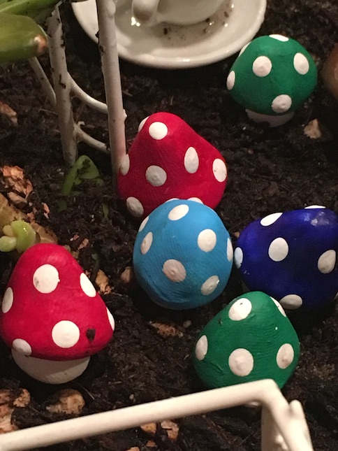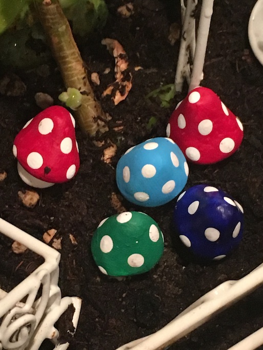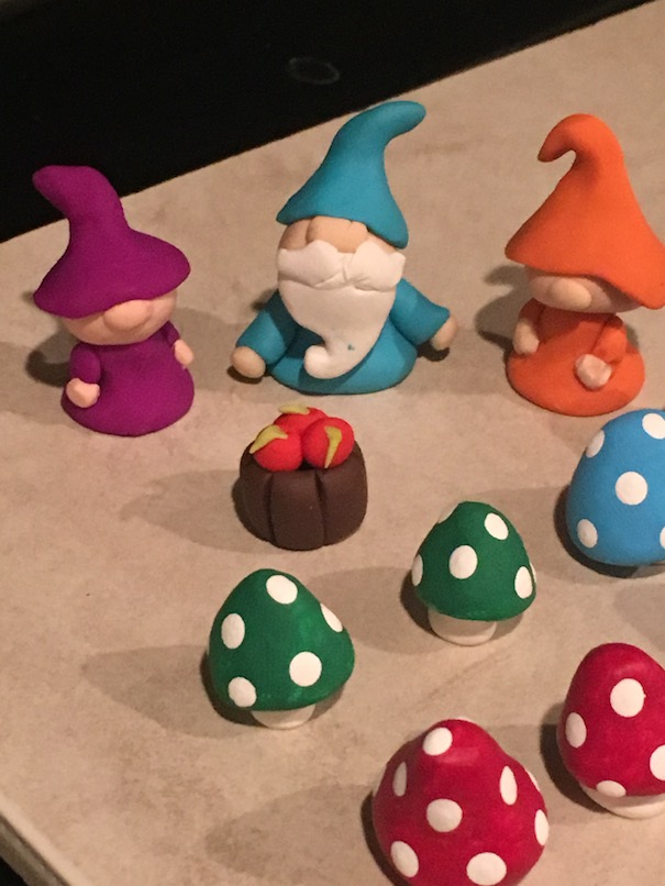 I painted the little mushrooms, and gave the little gnomes a basket of fruit. πŸ™‚