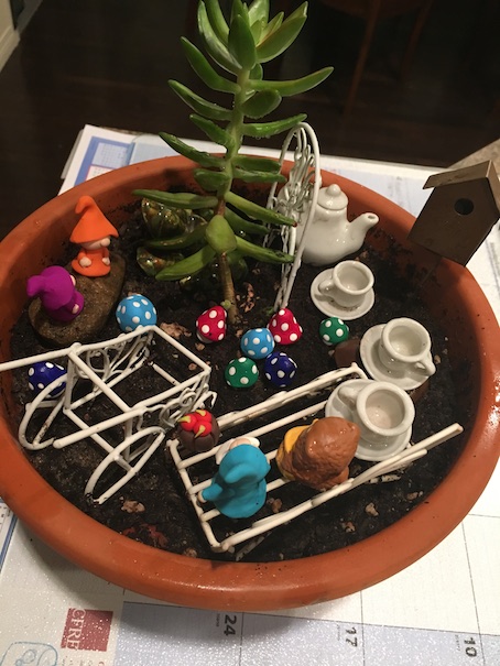 My mom pitched in for some fairy patio furniture, a mini wheelbarrow, and some other miniature accessories as well as a pot, while I made the little polymer clay gnomes and the mushroom pieces. I also brought some plants for her to put in her fairy’s garden.