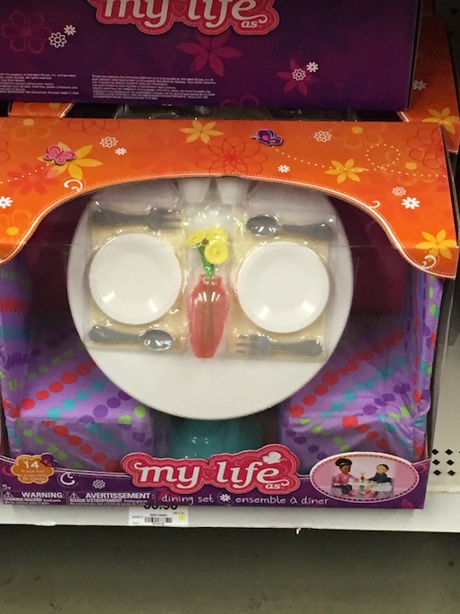 We are here today to show you the adorable-ness that is the MyLifeAs dining set from Walmart! I am very pleased with this set. I think it is a viable alternative to the AG dining set.