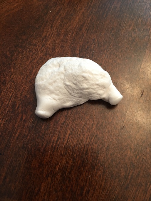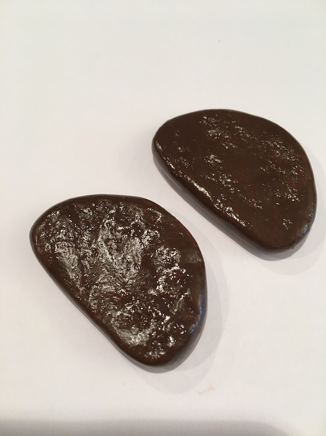 Meatloaf – Roll clay into a ball. Flatten the ball into a circle. Cut the circle in half. Round the centre edges of both half circles. Use your toothbrush to add texture to the top of the meat. Paint brown.